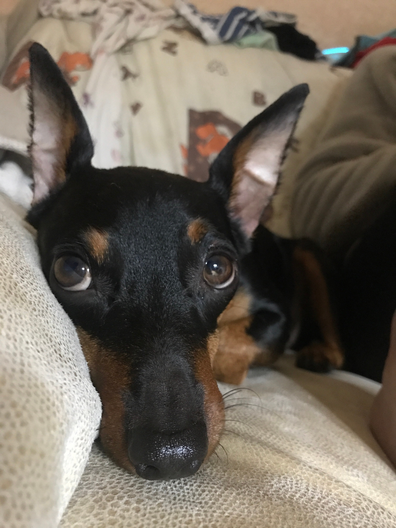 A close-up image shows a black and tan dog with erect ears lying on bedding. The dog's head is in the foreground, with a glossy black nose and wide, reflective eyes. The dog's ears are perked up, with…read more