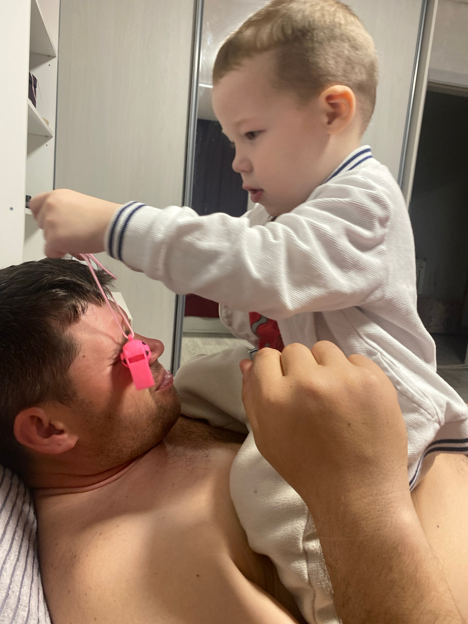 A young child, dressed in a white, long-sleeved shirt with blue trim, is standing over a man lying on his back. The man is shirtless and has a pink whistle on a string near his face. The environment a…read more