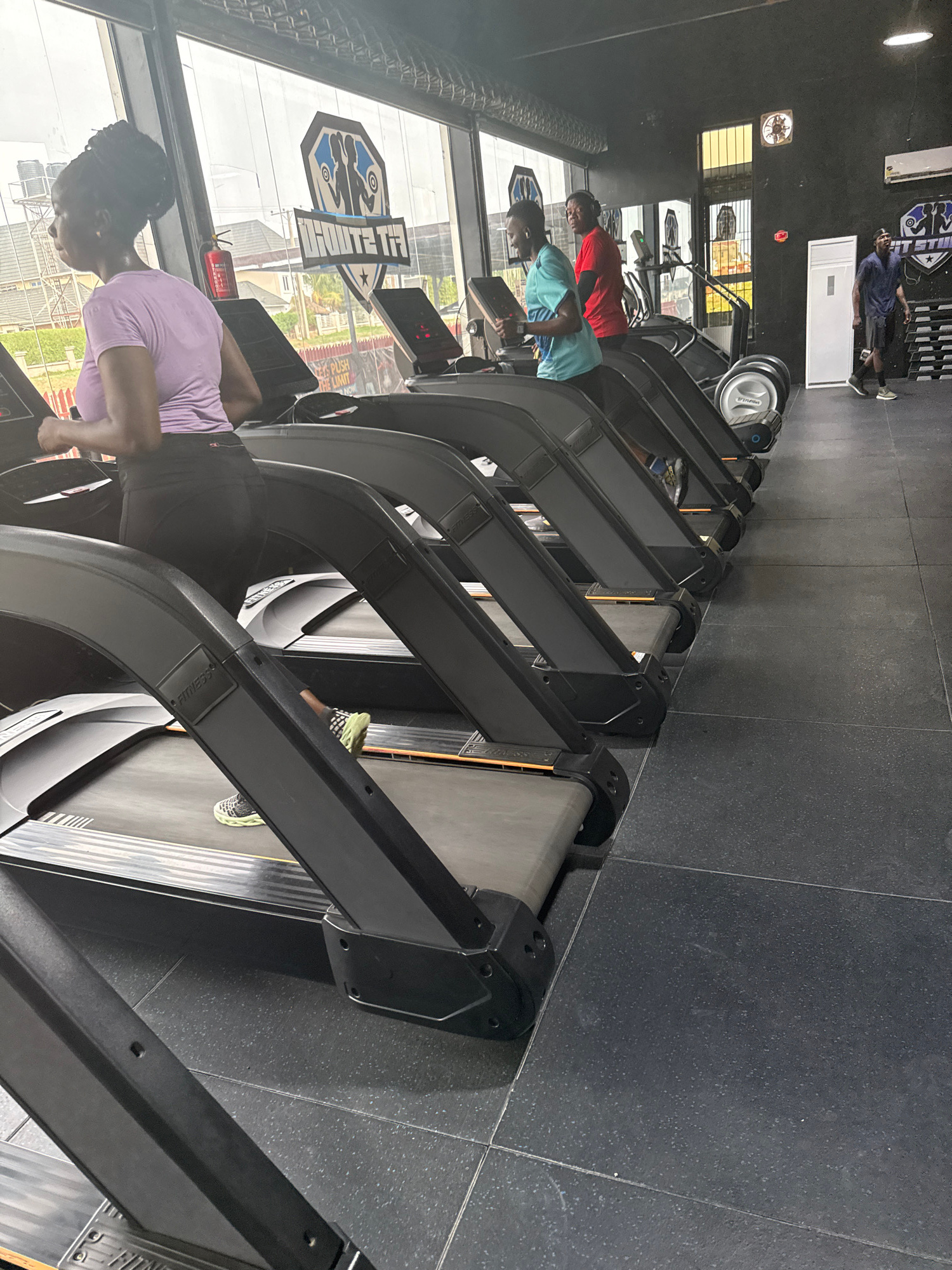 This media file depicts an indoor gym or fitness center in Rubuchi, Nigeria, during the daytime. The main focus is a row of modern, dark-colored treadmills, with several individuals engaged in exercis…read more