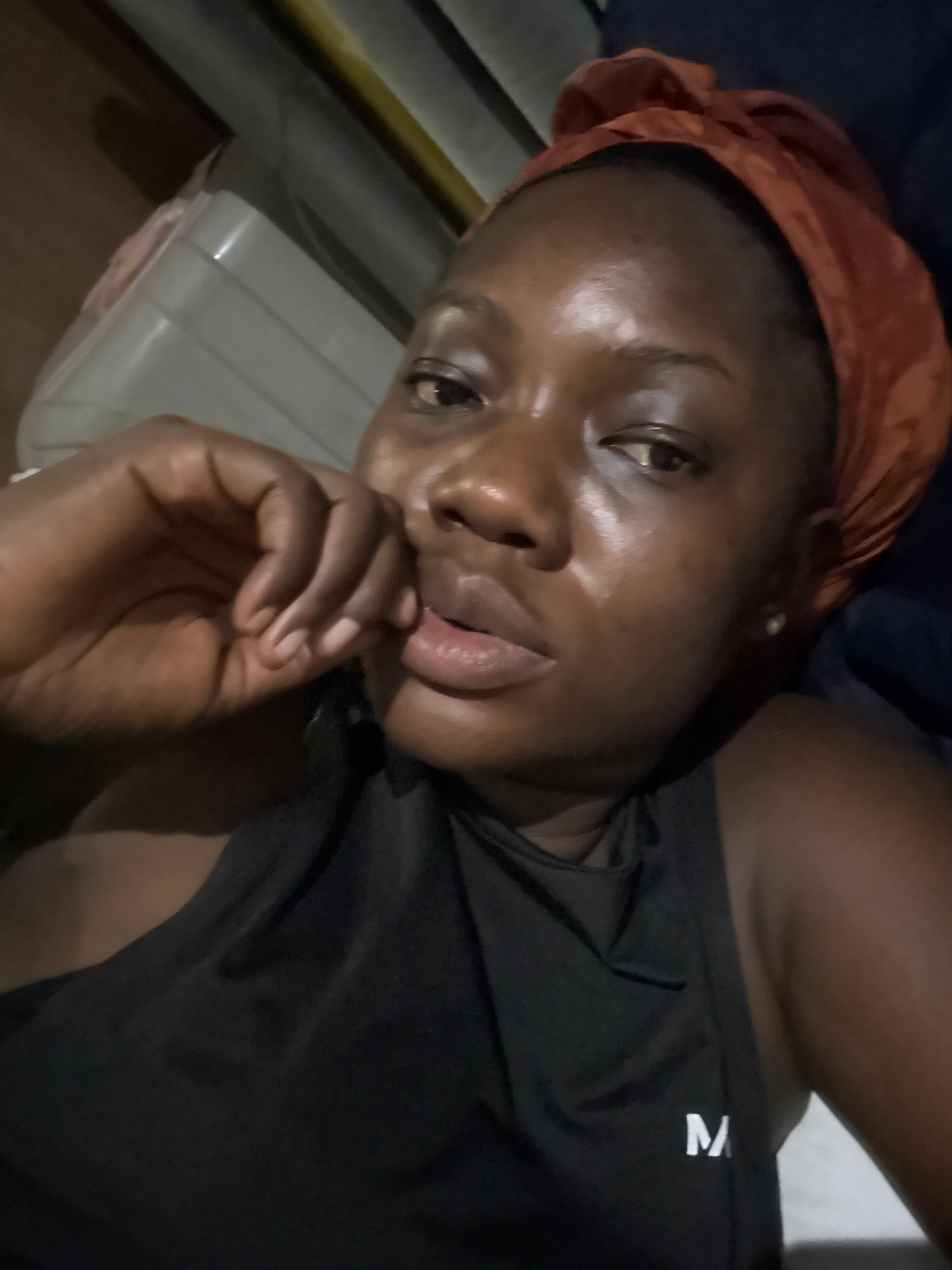 A dark-skinned person with a reddish-brown head wrap is lying down wearing a black top with a white "M" on the chest. Their right hand is partially obscuring their mouth. The background contains parts…read more