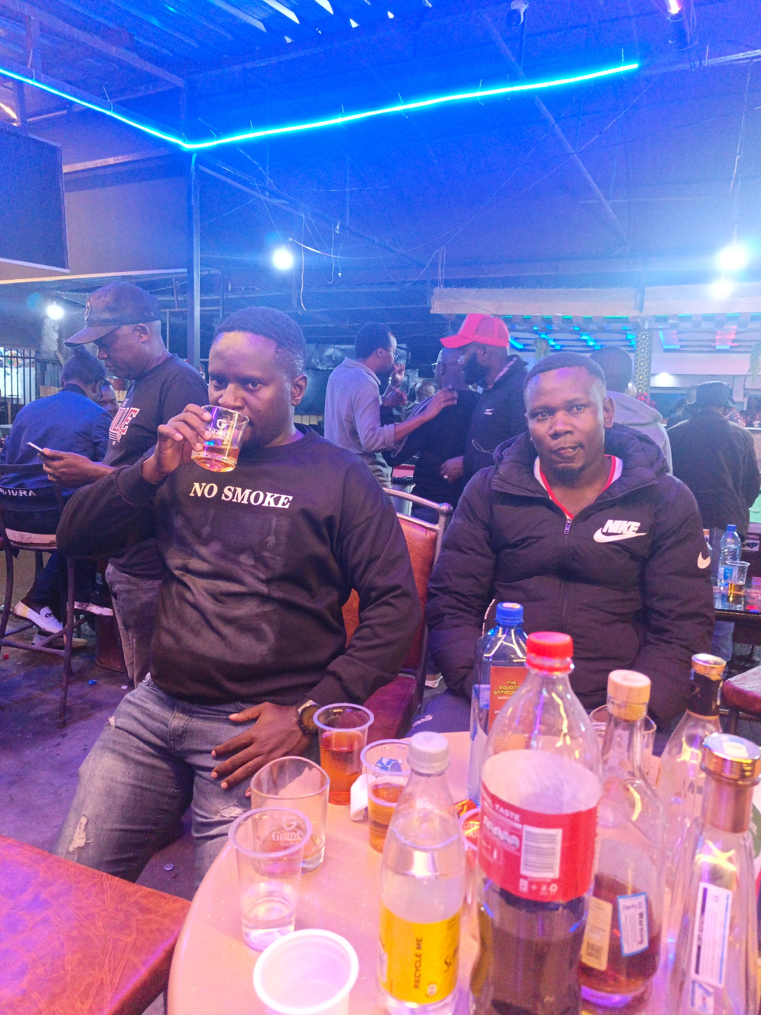 The image depicts an indoor scene, likely a bar or restaurant in Nairobi, Kenya, based on the appearance and context. Two men are prominently featured at a table filled with multiple bottles of alcoho…read more