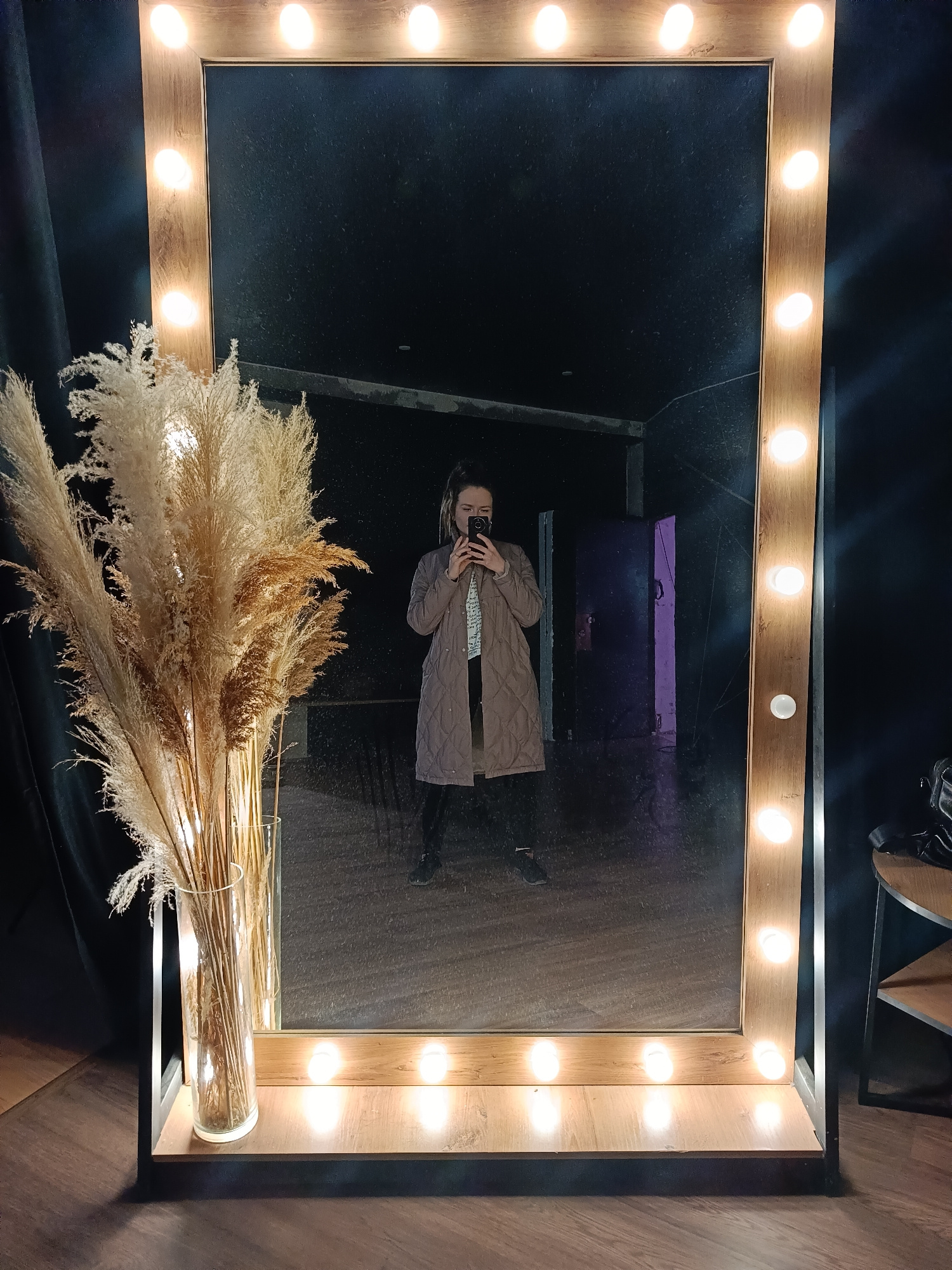 A full-length photograph depicts a person taking a mirror selfie. The individual is centrally positioned in the mirror's reflection, wearing a light brown quilted coat over patterned clothing and dark…read more