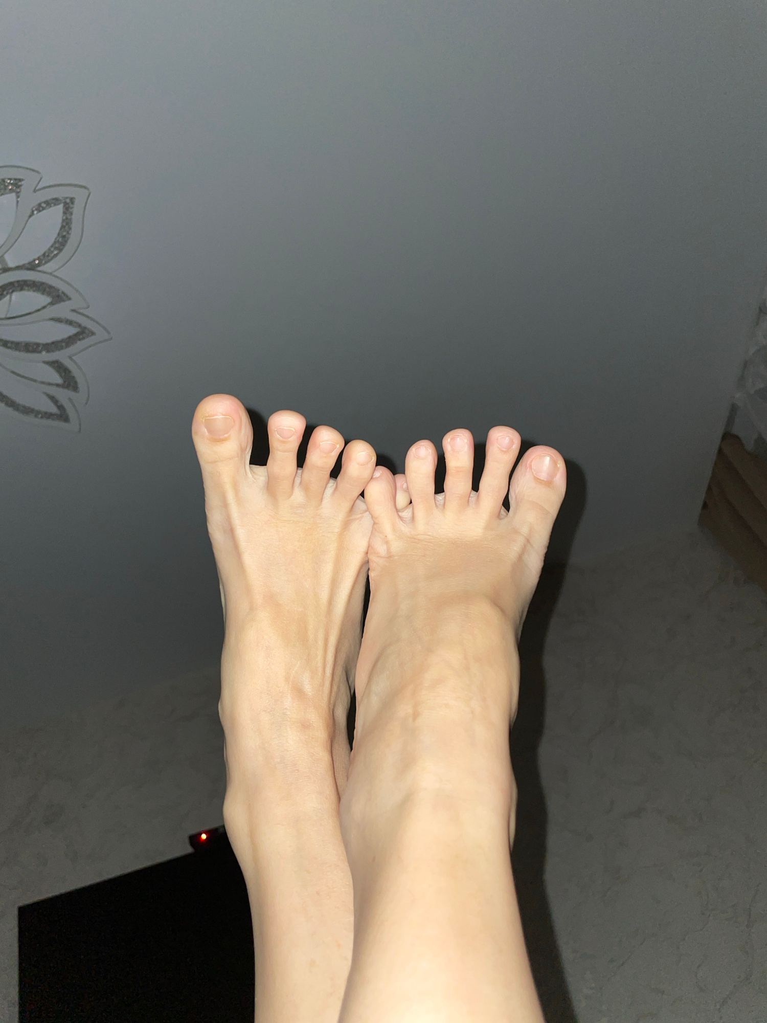 The image depicts two human feet, presumably belonging to the same individual, in a recumbent position. The feet are pale, with visible toes and toenails. The background consists of a two-tone wall, l…read more