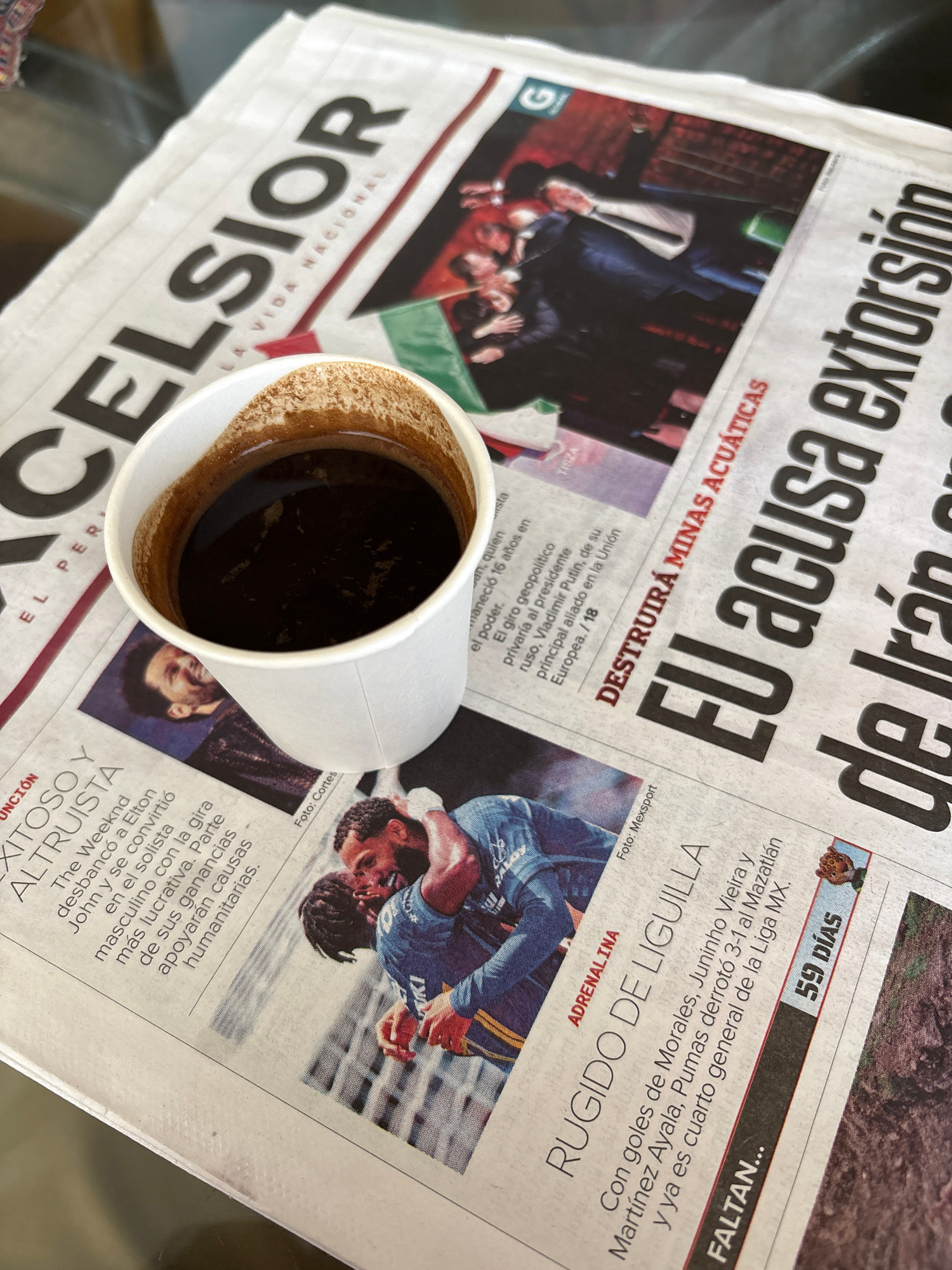 The image shows a cup of coffee placed on a newspaper. The newspaper is identified as "Excélsior", a Mexican newspaper, but it's not possible to determine the exact location in Huixquilucan de Degolla…read more