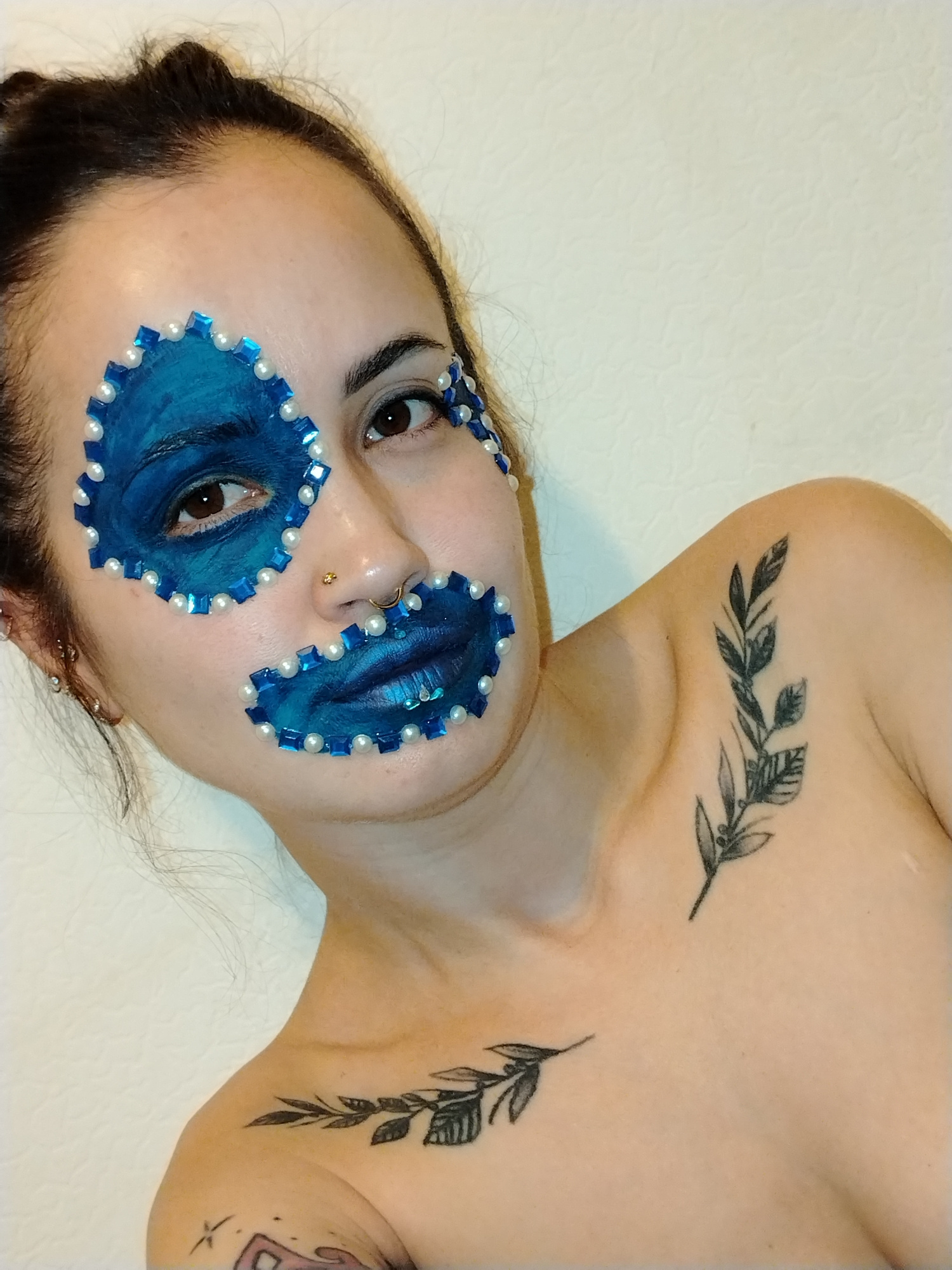 A close-up studio portrait shows a light-skinned woman with her dark hair pulled back. She has blue face paint around her right eye and mouth, decorated with small white pearls and blue square gems. Aβ¦read more
