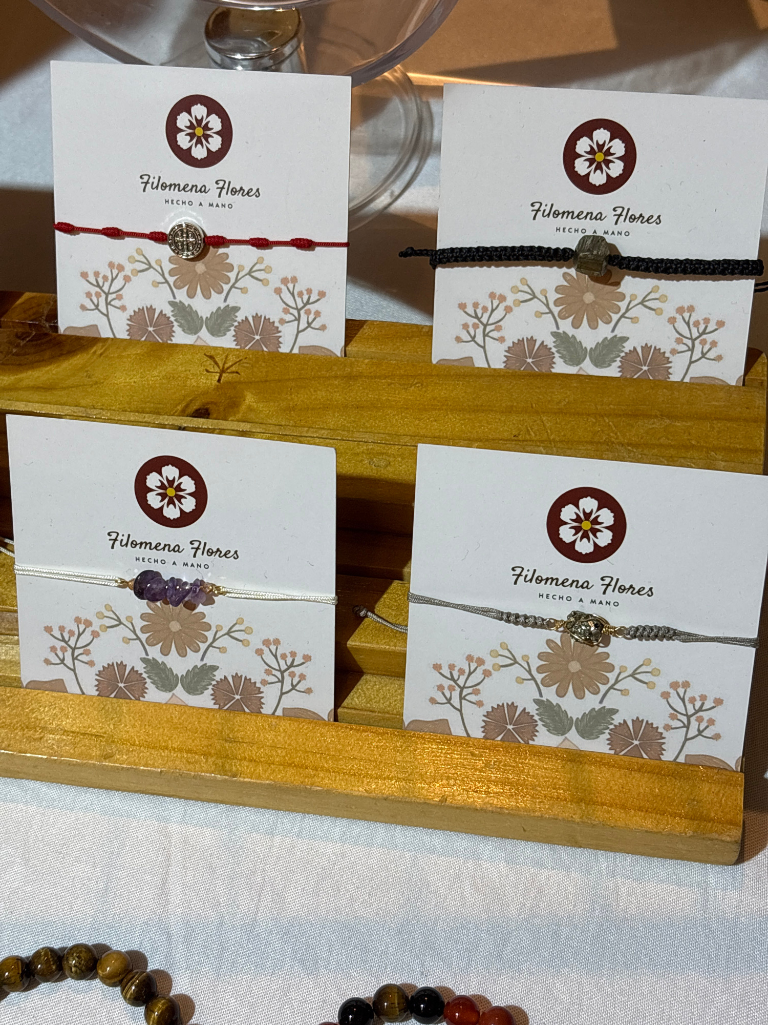 The image shows a display of handmade bracelets attached to cards. The cards have the logo and name "Filomena Flores" and the phrase "HECHO A MANO," which means "handmade" in Spanish. The bracelets ar…read more