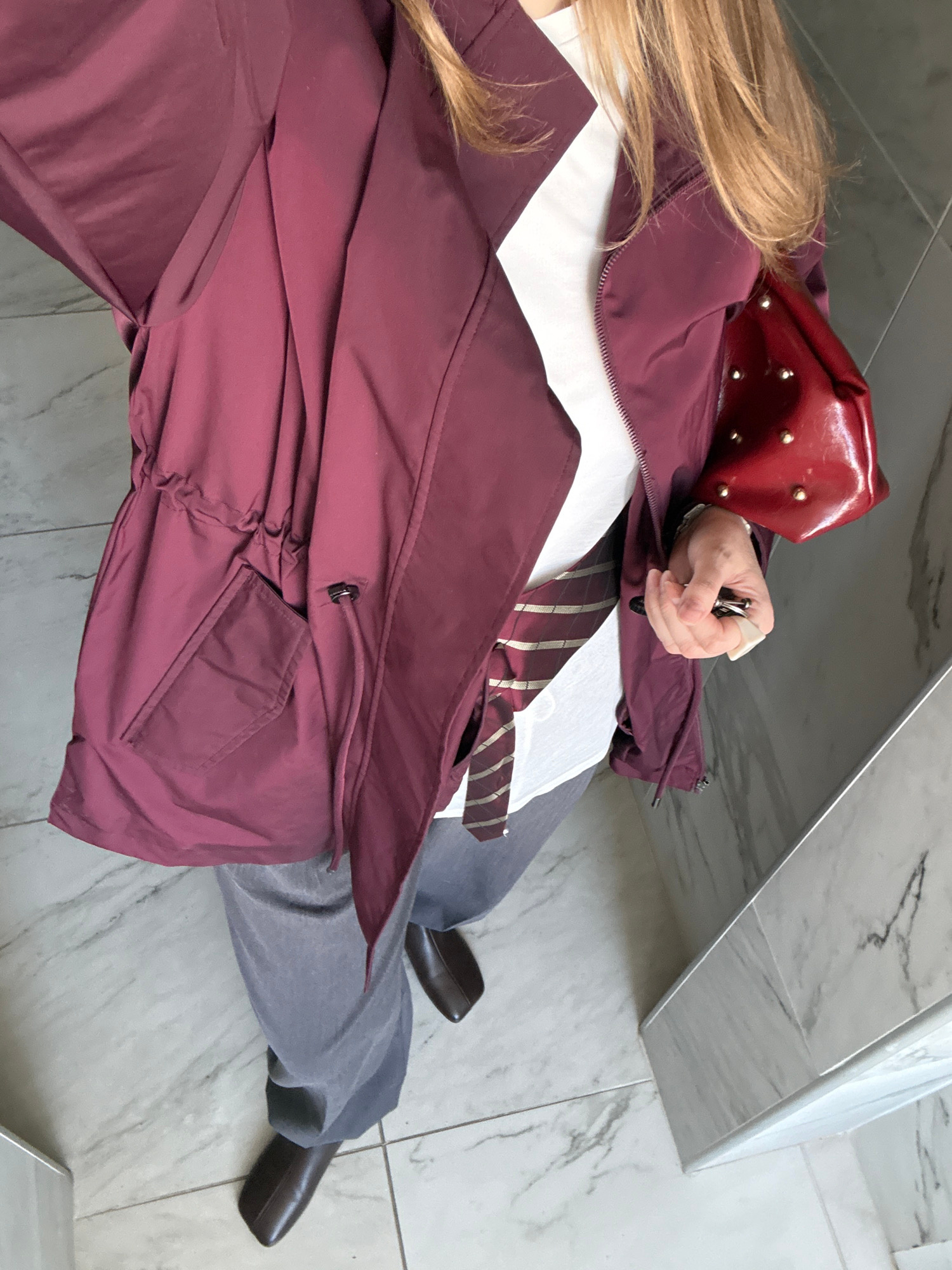 A person in a maroon coat and gray pants stands on a marble floor. They wear dark brown shoes and a striped tie. The person holds a pen in their hand, and a red purse is visible. The location appears…read more