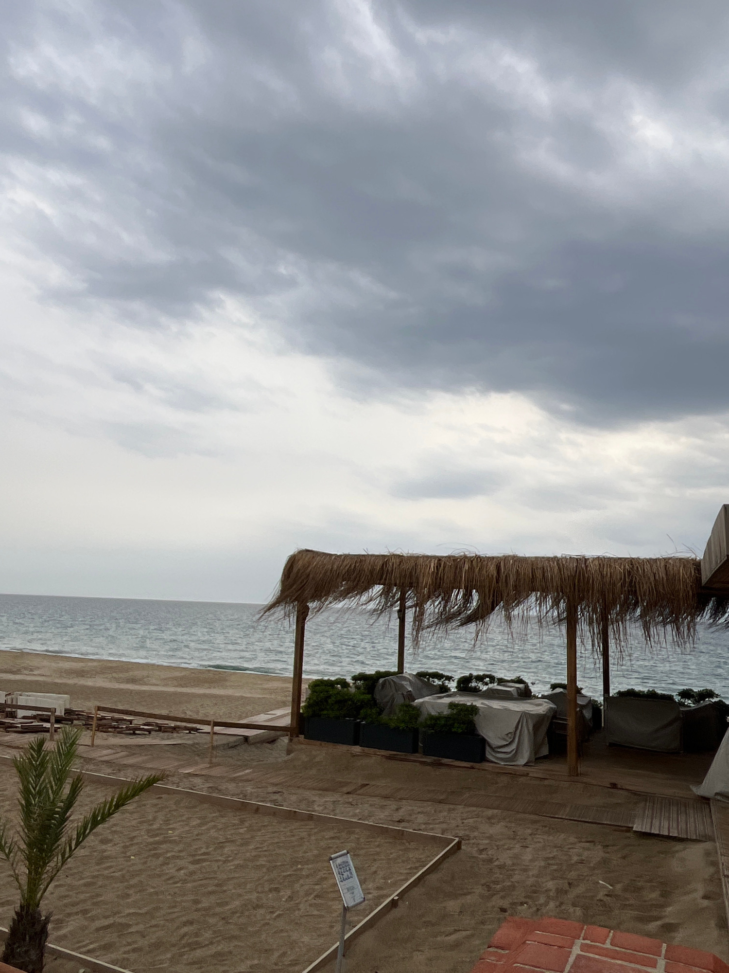 The image captures a beach scene on an overcast day, likely in Alanya, Turkey, judging by the vegetation and beach setup. To the right, a sandy area contains beach umbrellas, tables, and chairs, with…read more