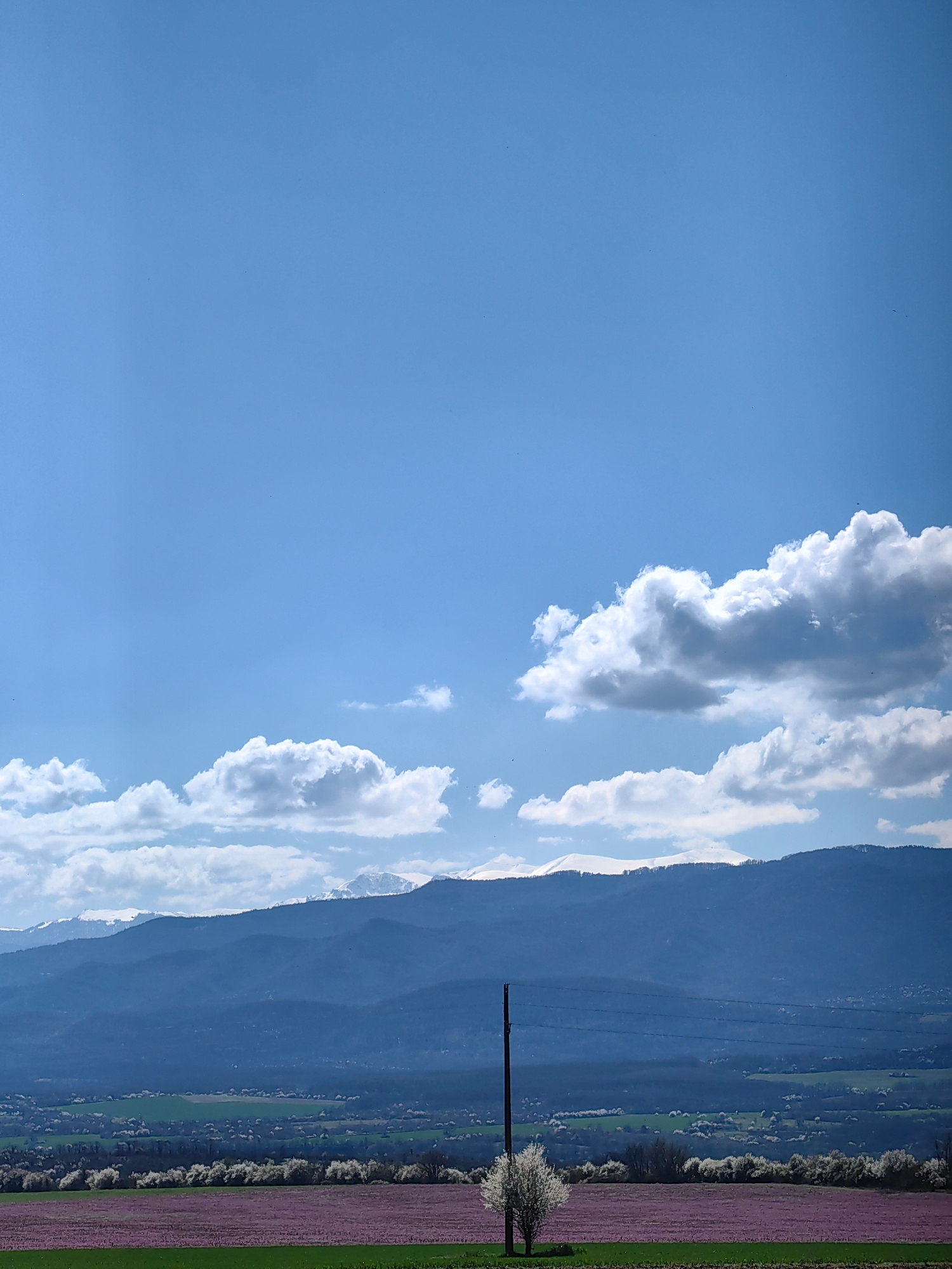 The image depicts a landscape near Shumata, Bulgaria. The foreground consists of a field of purple flowers and green grass. A single white tree stands in the field. A line of white flowering trees sitβ¦read more
