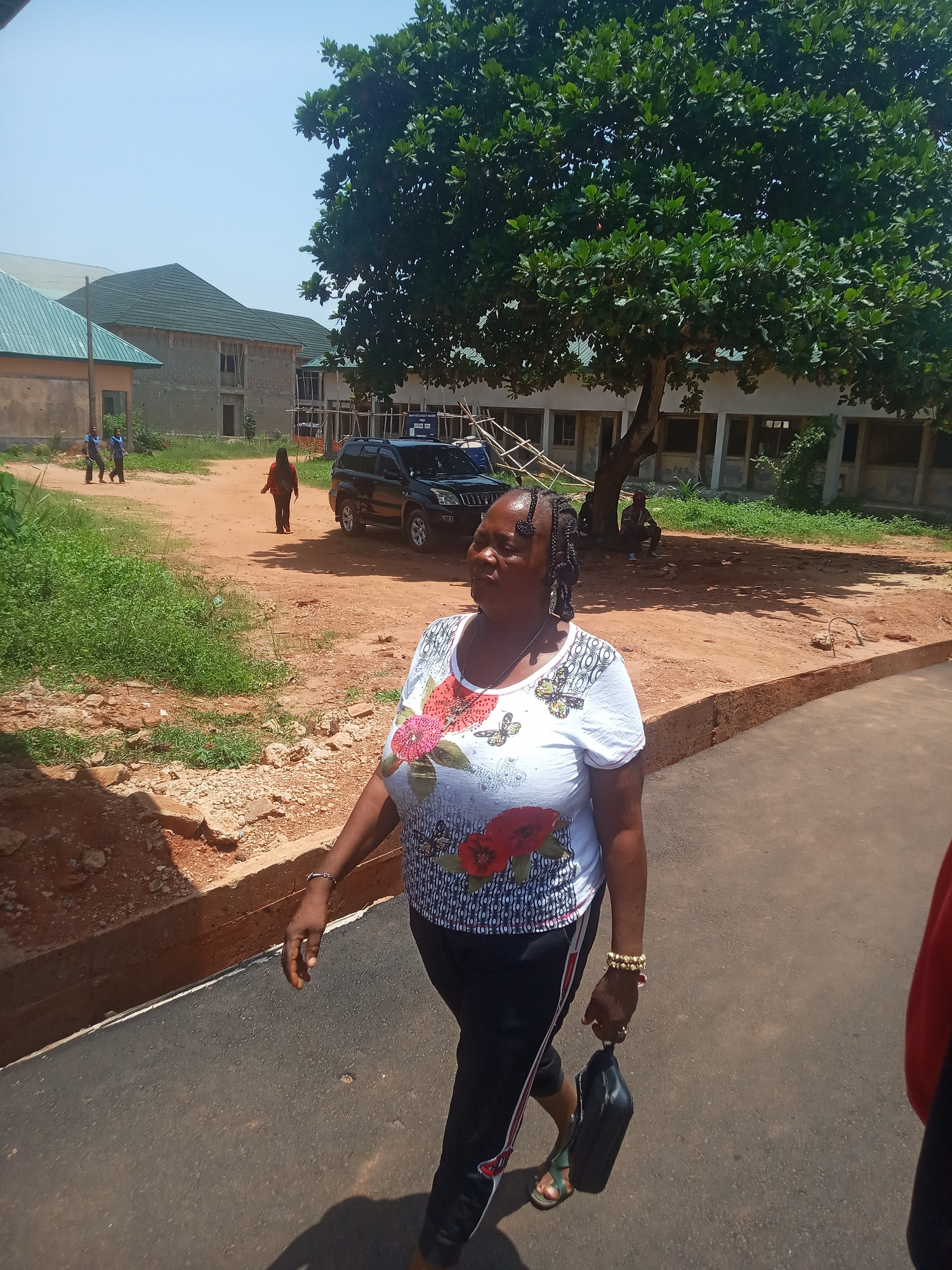 The image shows a woman walking on an asphalt road. She is wearing a white shirt with floral designs, black pants with a red stripe, and sandals. She is carrying a black purse in her left hand and has…read more