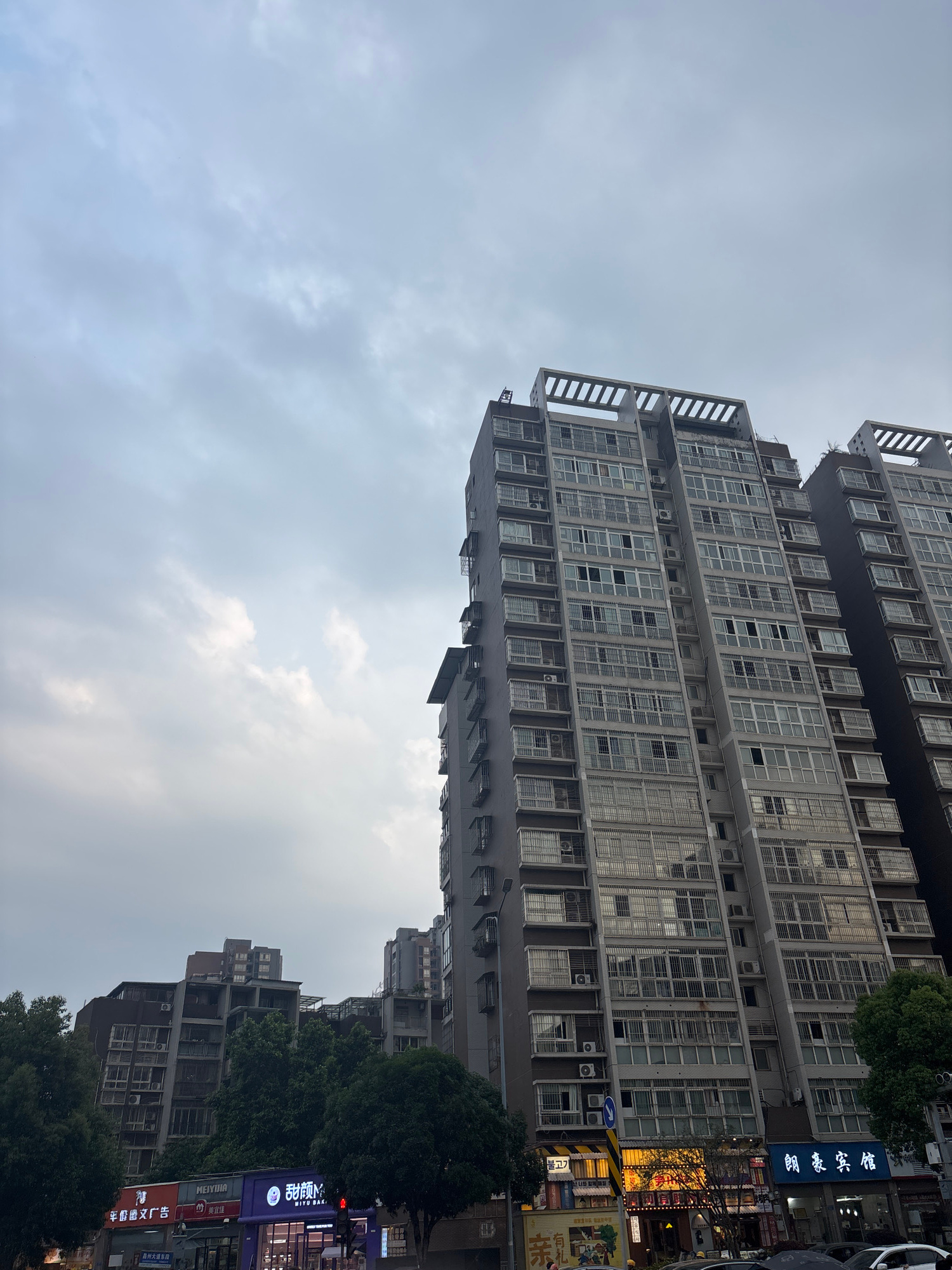 The image shows a tall, multi-story building in Yongchuan, China, with many windows and balconies. The sky is overcast. The street level includes trees and storefronts with Chinese signage and writing…read more