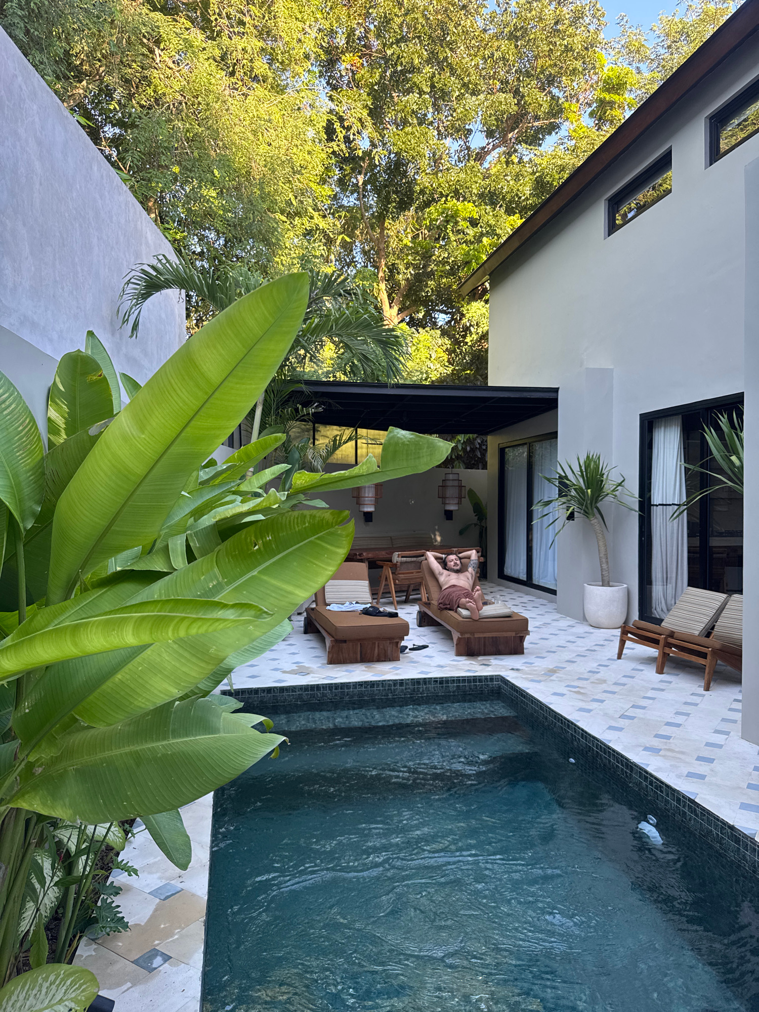 The image depicts an inviting outdoor scene at a modern tropical villa or resort, situated in what appears to be a lush natural environment, consistent with the Kuta Selatan, Indonesia context. The pe…read more