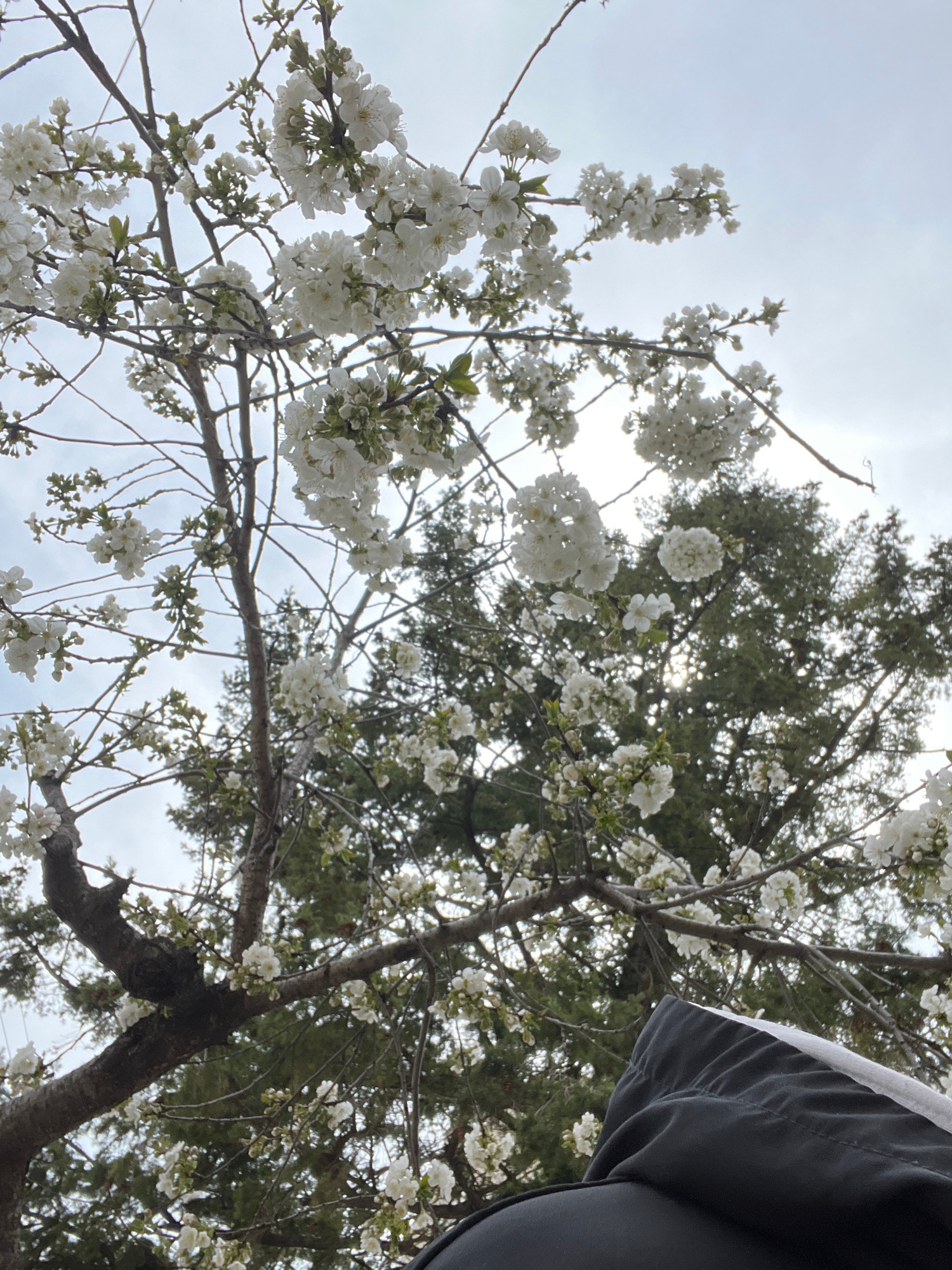 The image shows a tree with white blossoms against a cloudy sky. Part of a person's dark gray clothing appears in the upper right corner. The tree has thin branches and some green foliage mixed in wit…read more