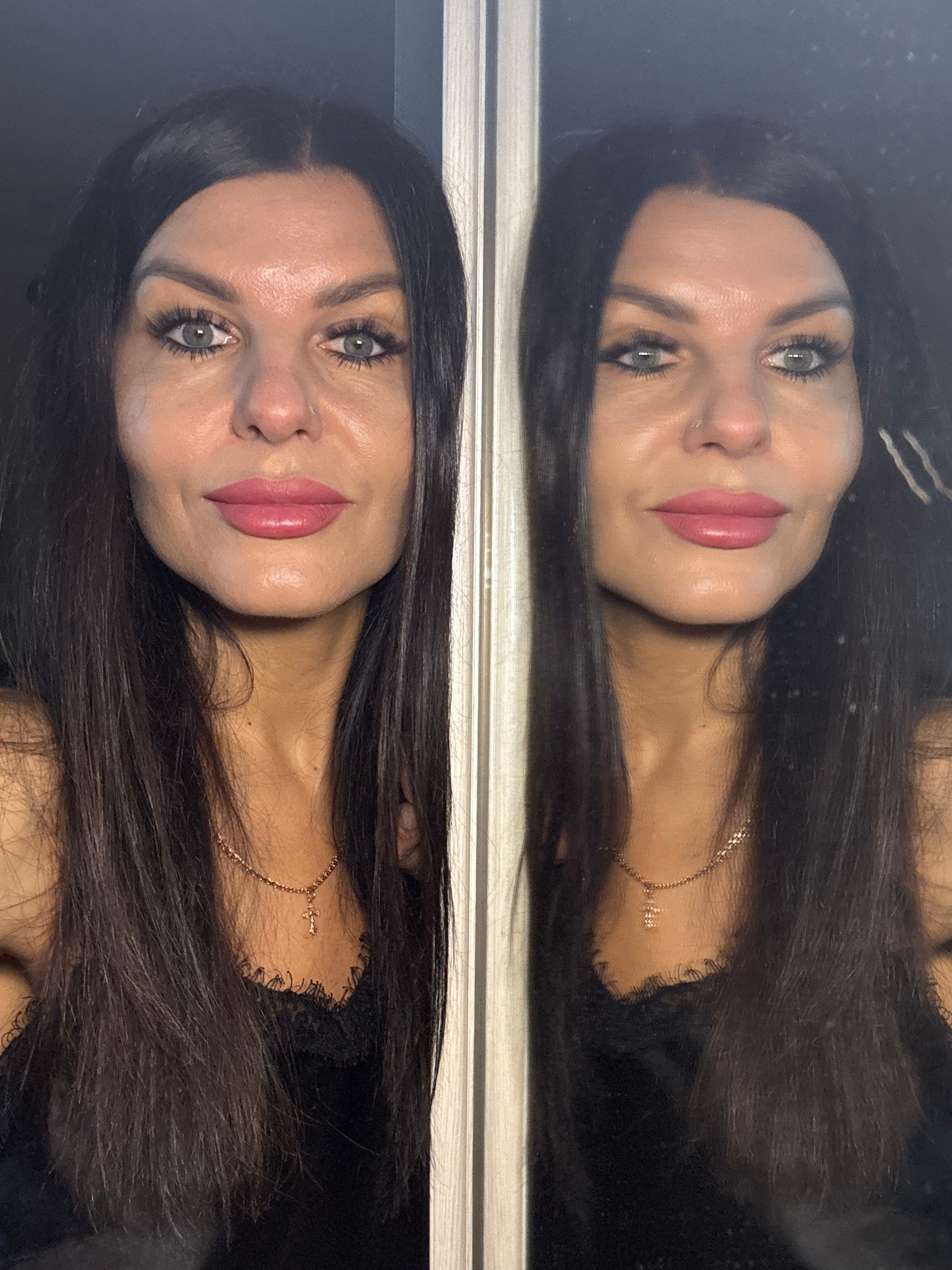 A woman is reflected in a mirror. She has dark hair, light eyes, and pink lipstick. She is wearing a gold necklace with a cross pendant. The location is not discernible from the image.