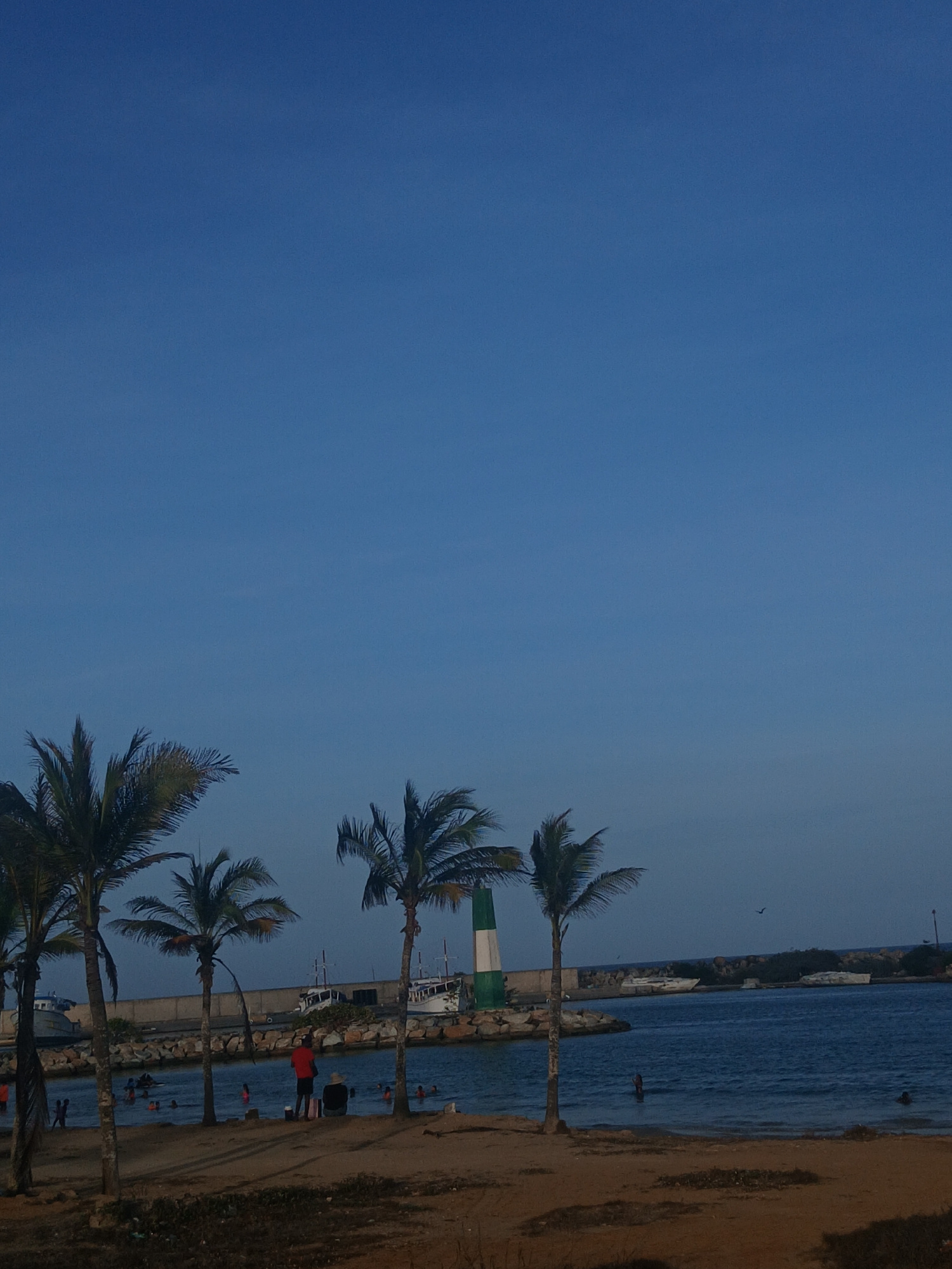 The image depicts a coastal scene in Porlamar, Venezuela. The sky is a gradient of blues. A series of palm trees line the edge of a sandy beach. Beyond the beach is the ocean with people swimming. A gā¦read more