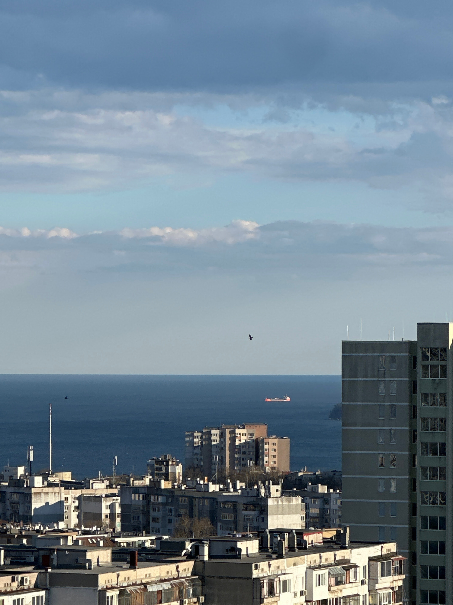 The image presents a view from an elevated position in Varna, Bulgaria. The scene is vertically oriented. On the right side, the urban landscape reveals a dense collection of residential and commercia…read more