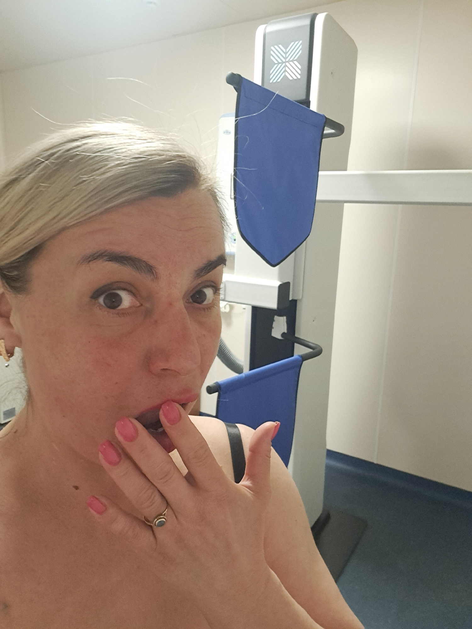 A selfie-style photo shows a woman with blonde hair and pink nail polish, who appears to be indoors in what looks like a medical examination room, with part of an X-ray or mammogram machine visible in…read more
