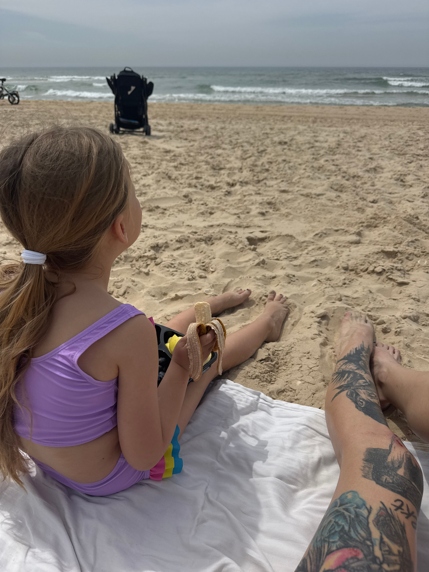 A young girl with blonde hair in a ponytail, wearing a lavender swimsuit, is lying on a white blanket on a sandy beach in Bat Yam, Israel. She is holding a snack container. Nearby are adult legs withβ¦read more
