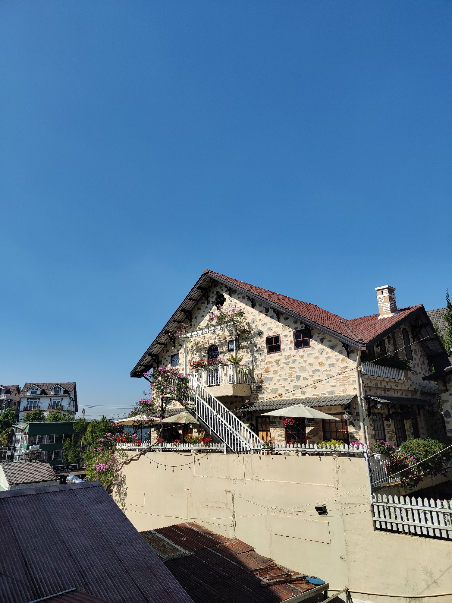 The image captures a charming stone house in Cam Ly - Đà Lạt, Vietnam, adorned with pink flowers climbing its facade. A white staircase leads to a balcony. Two white umbrellas provide shade for the pa…read more