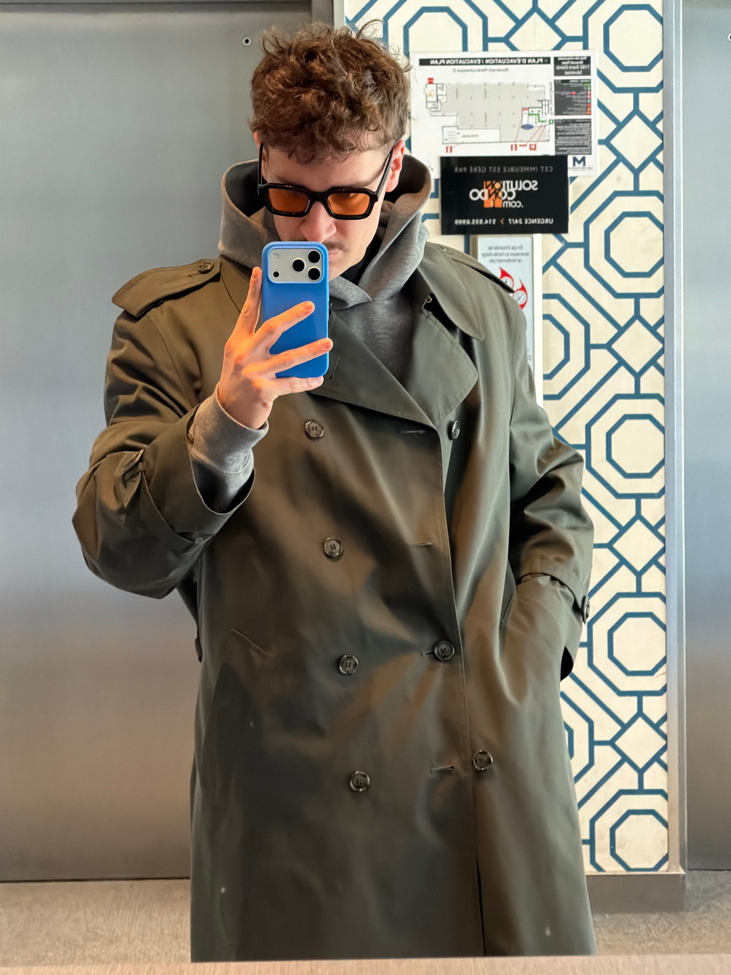 A male individual is depicted from the chest up, capturing his reflection with a smartphone in an indoor setting. He has curly brown hair and a mustache, and wears black-framed, orange-tinted rectangu…read more