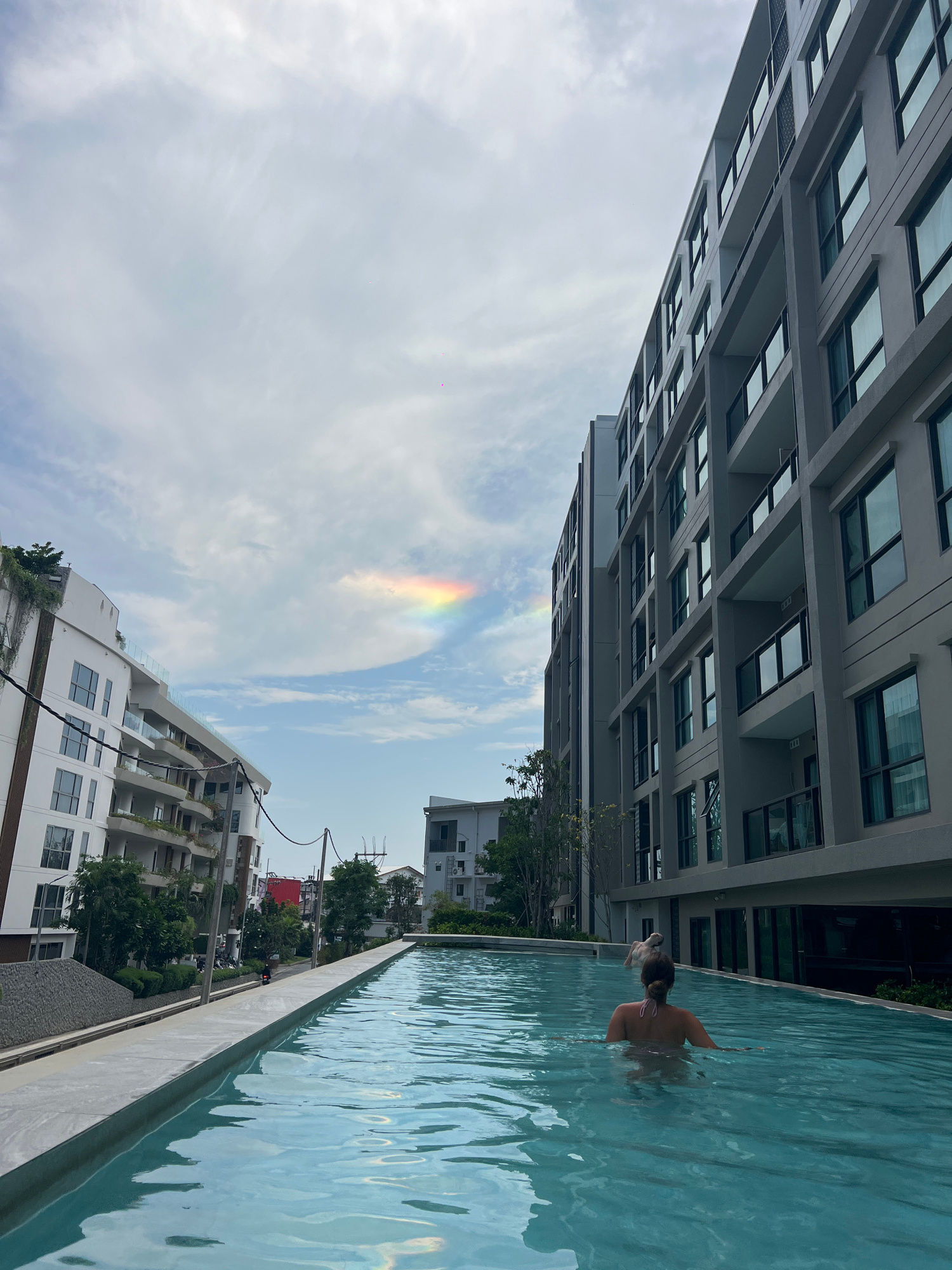 A person is swimming in a pool next to a tall building in Choeng Thale, Thailand. The sky is cloudy with a hint of rainbow. Other buildings are visible in the background.