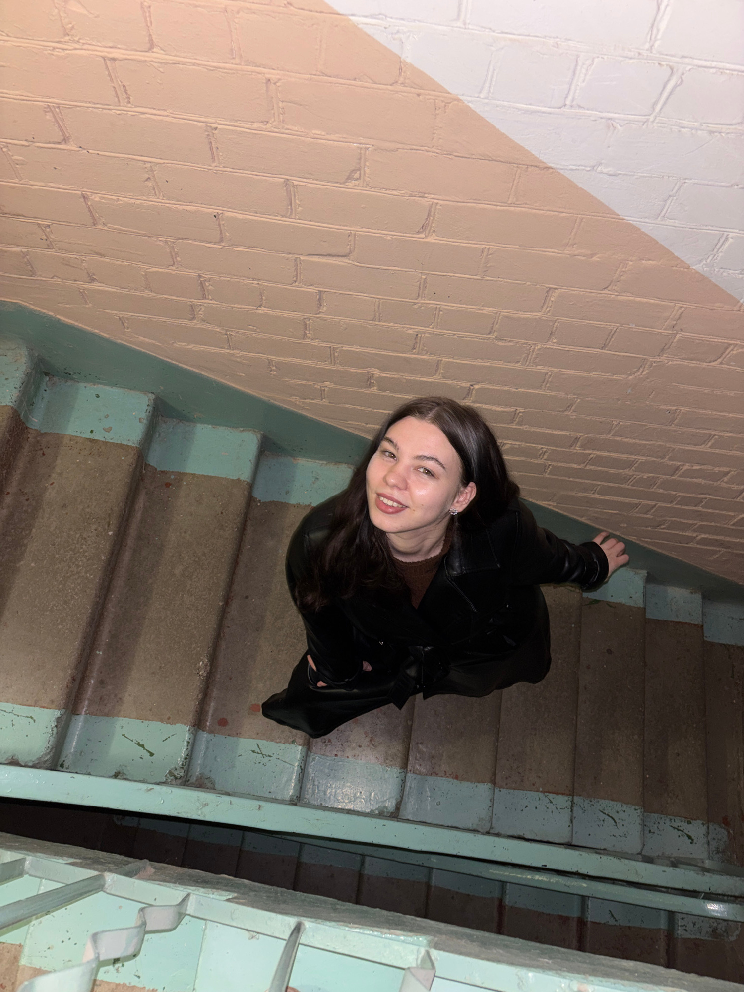 The image captures a young woman posing on an indoor concrete staircase, looking up towards the camera with a wide smile. She has long, dark hair and is dressed in a black leather jacket over a brown…read more