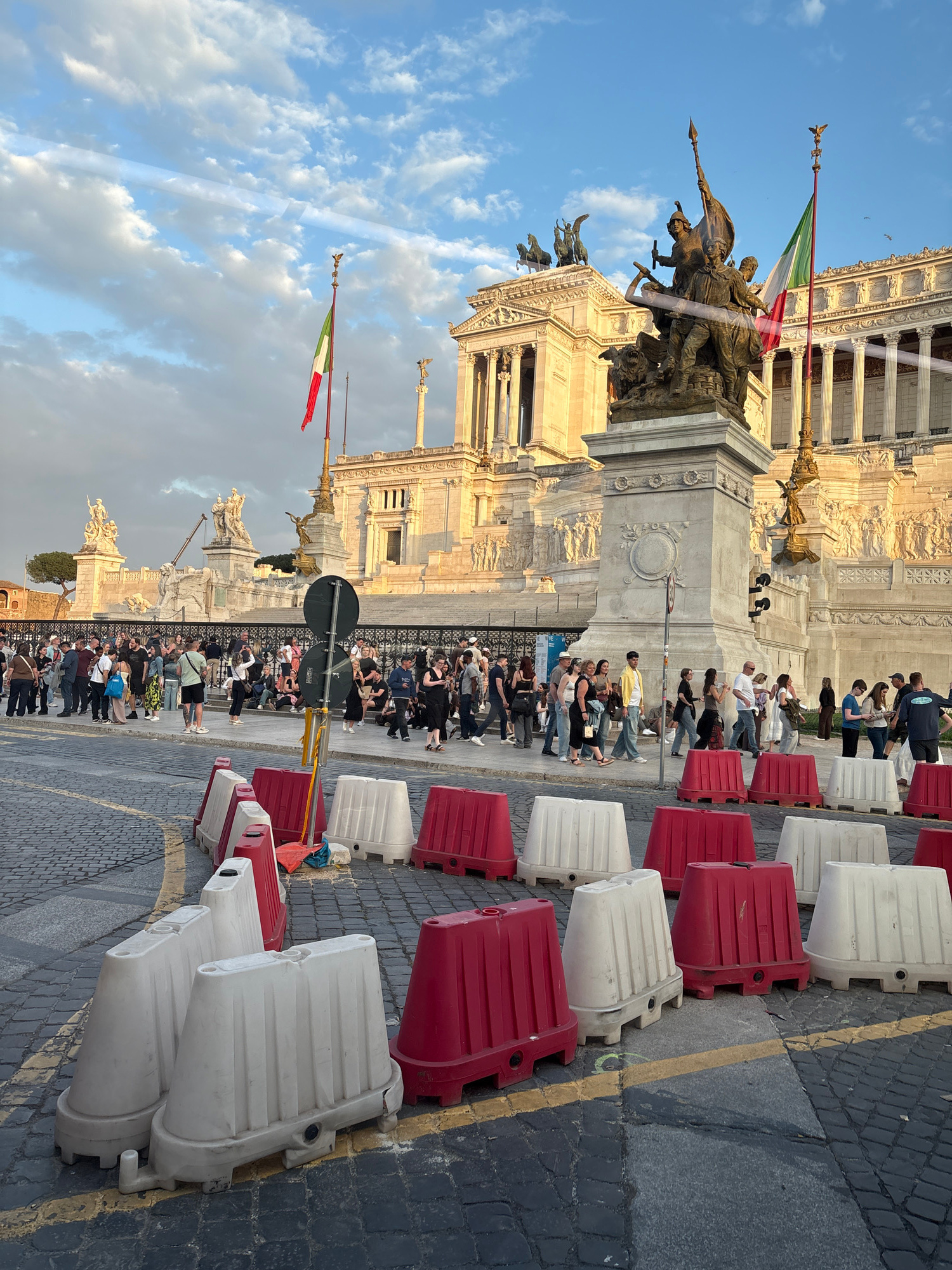 The image depicts the Vittoriano monument in Rome, Italy, under a partly cloudy sky. A crowd of people is visible along the base of the monument. The Italian flag is displayed atop the structure. In t…read more