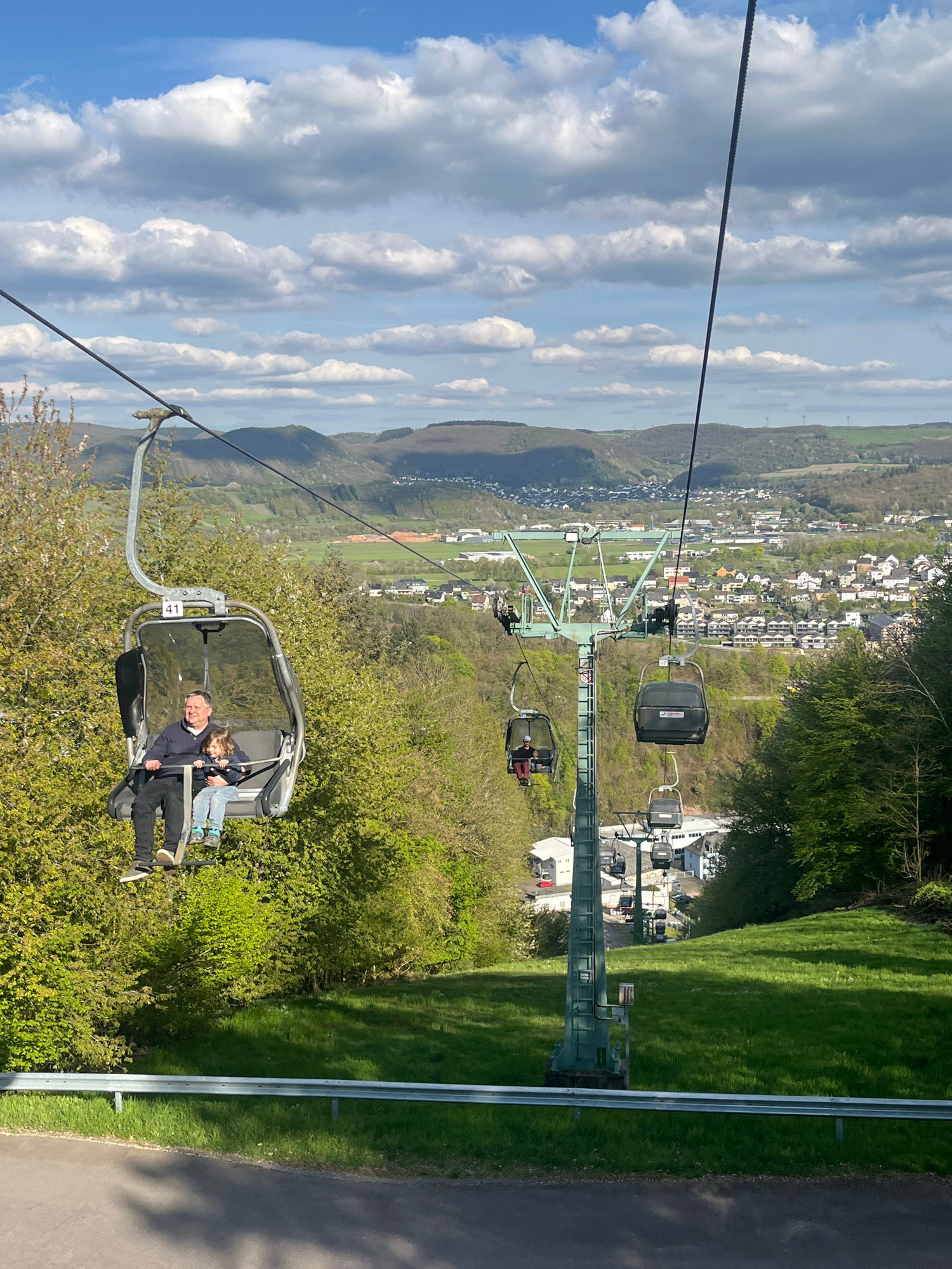 The image shows a view from a chairlift in Saarburg, Germany. A man and a child are riding in one of the chairlift cabins. The chairlift is moving over a green, wooded area and a cityscape. In the dis…read more