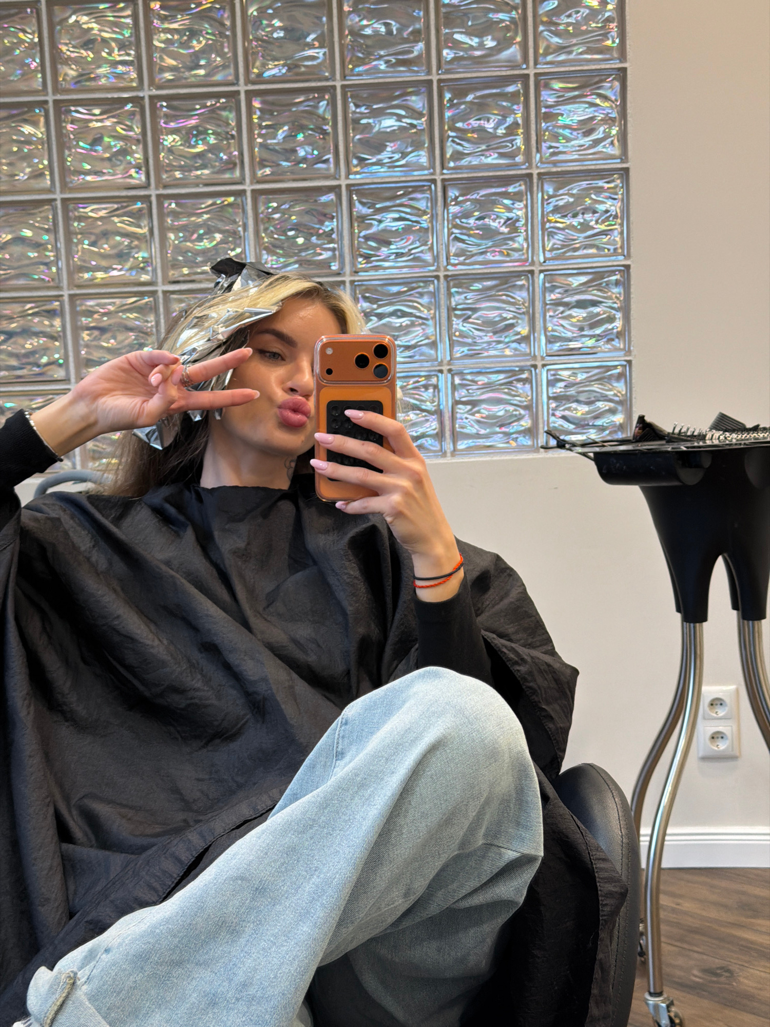 The image depicts a young woman taking a selfie in what appears to be a hair salon. She is wearing light blue jeans and a black hair salon gown. She is holding up a peace sign with her left hand and pā¦read more