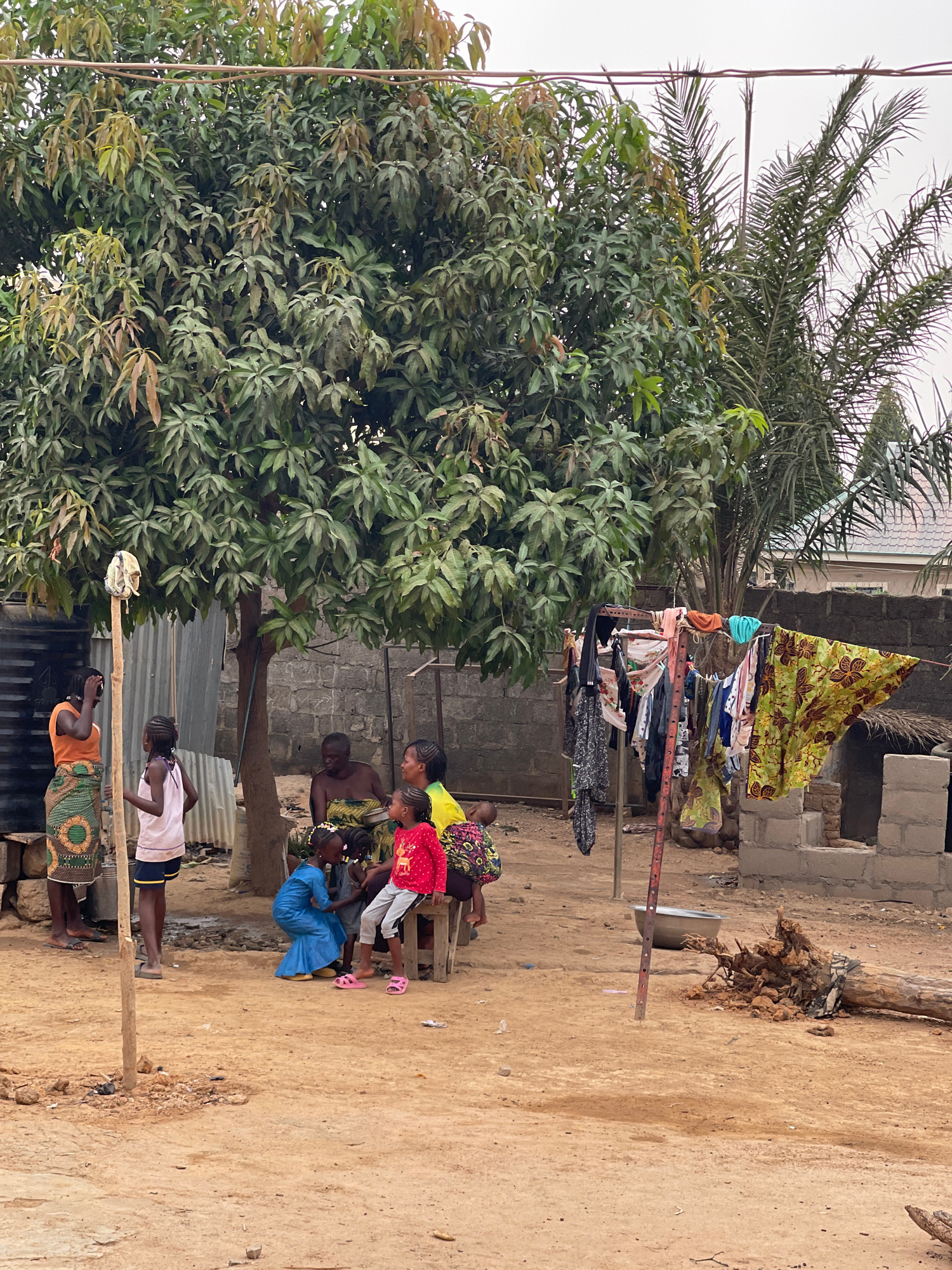 The image depicts an outdoor scene in Rido, Nigeria. A group of people, including women and children, are gathered on a dirt ground. Some are seated on wooden stools. A clothesline with drying clothes…read more
