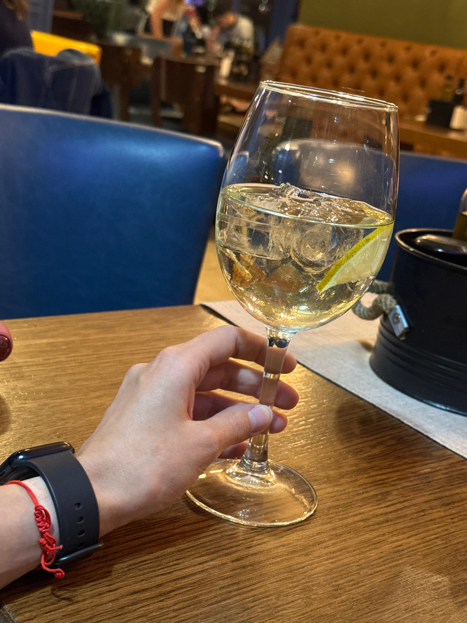 The image shows a person holding a wine glass filled with a light-colored liquid (likely white wine) and ice, garnished with a slice of lemon. The setting appears to be a restaurant or bar. The person…read more