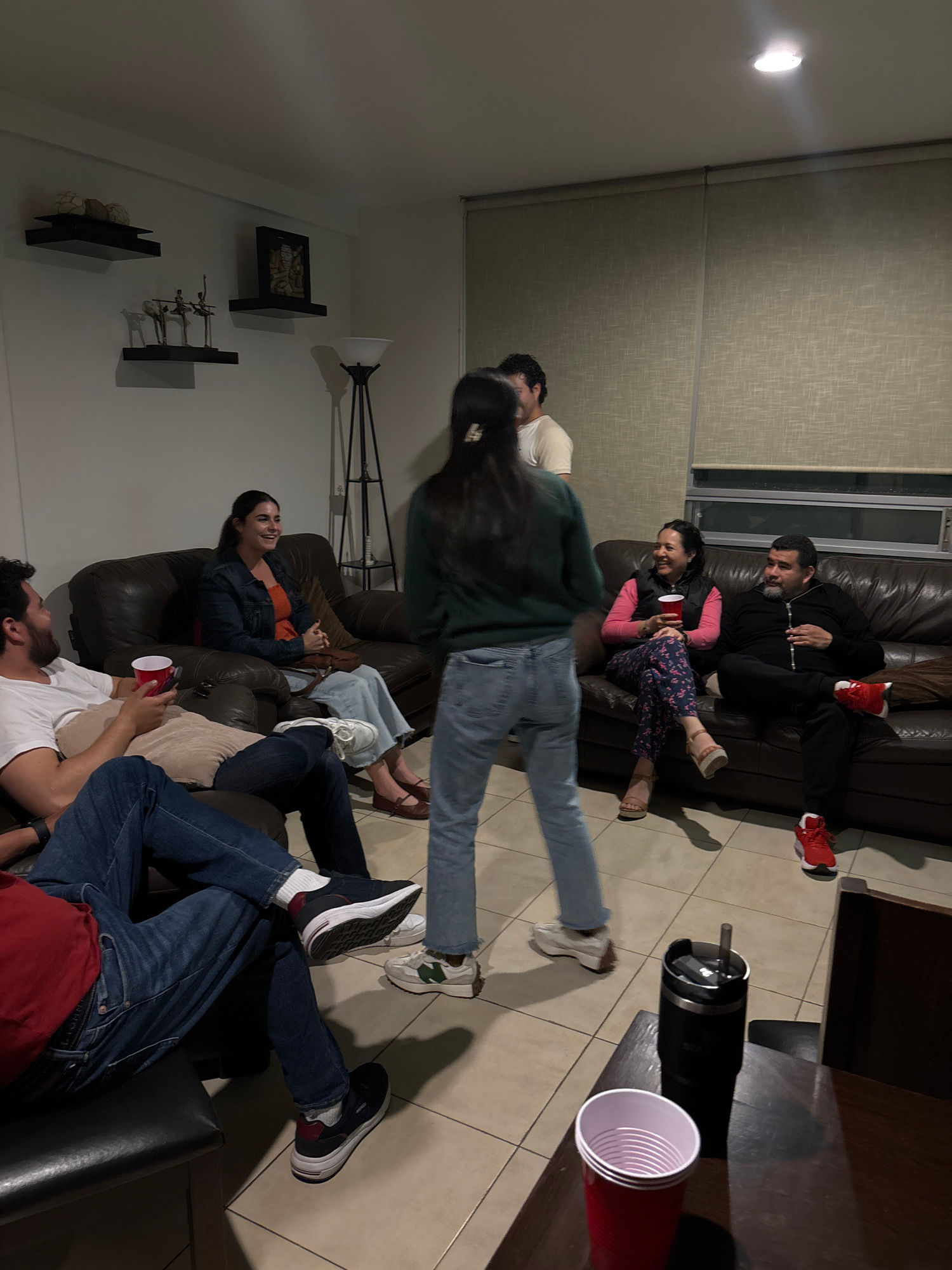 The image depicts an indoor scene with several people gathered in a living room. The location is plausibly in Puebla, Mexico, given the style of the furnishings and architecture. Several individuals…read more
