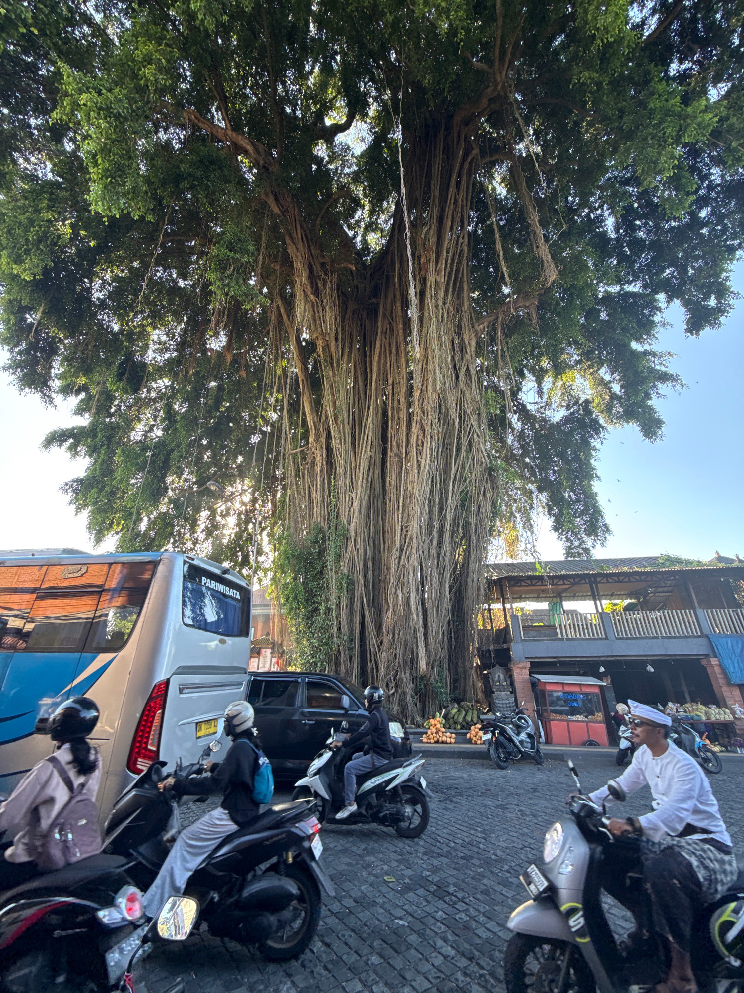 This image depicts a street scene in Ubud District, Indonesia. A large banyan tree with extensive aerial roots dominates the view, its foliage filling the upper left quadrant and the roots appearing t…read more
