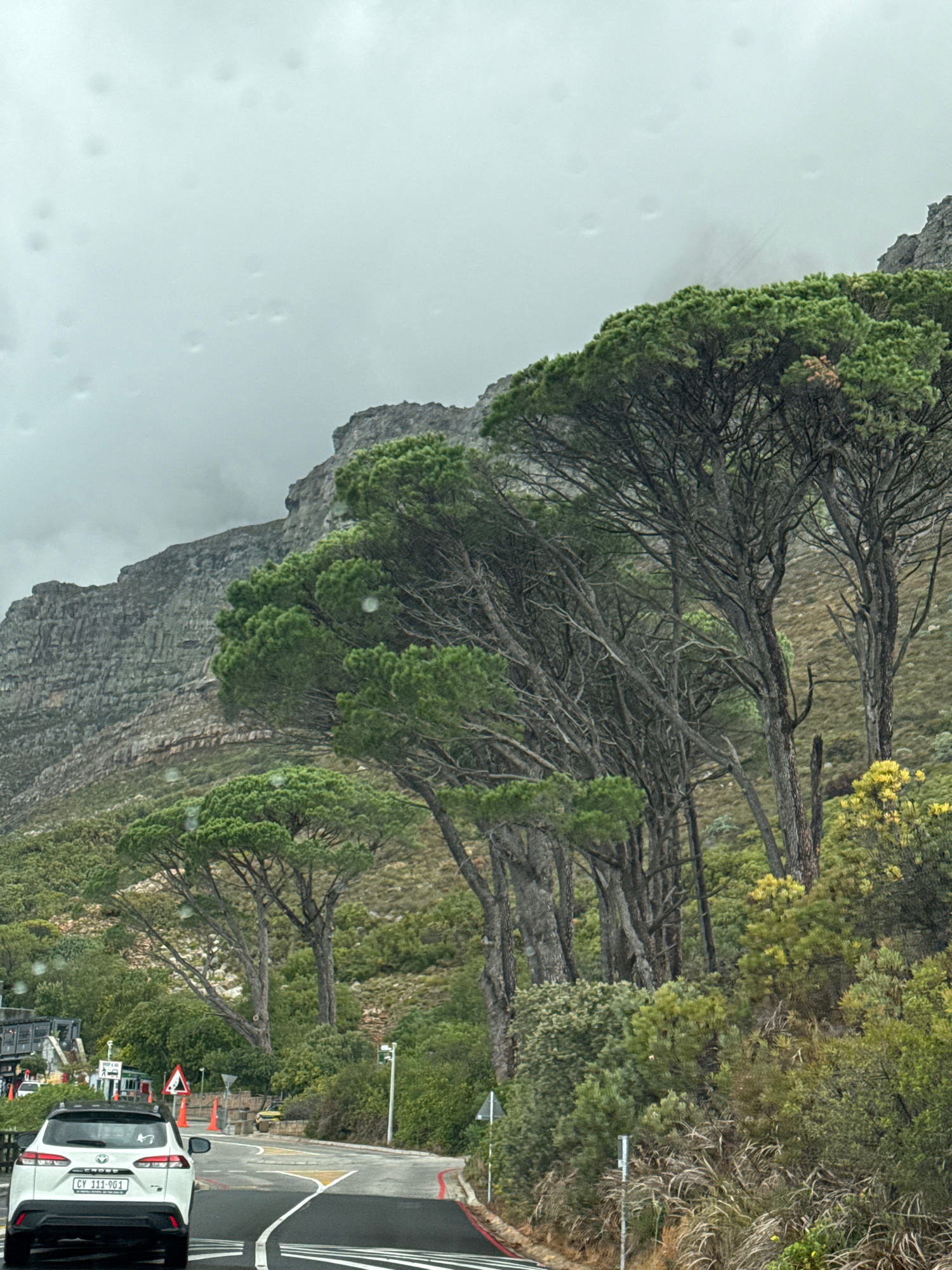 The image captures a mountainous landscape on an overcast day, seemingly viewed from inside a vehicle with raindrops visible on the window. An imposing, steep, rocky mountain face dominates the left s…read more
