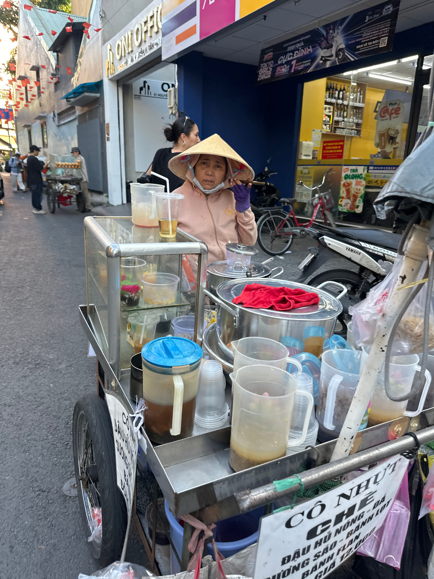 A street food vendor operates a pushcart on an asphalt road in Thủ Đức, Vietnam. A woman with light skin, wearing a pink hooded jacket, purple gloves, and a traditional Vietnamese conical hat (nón lá)…read more
