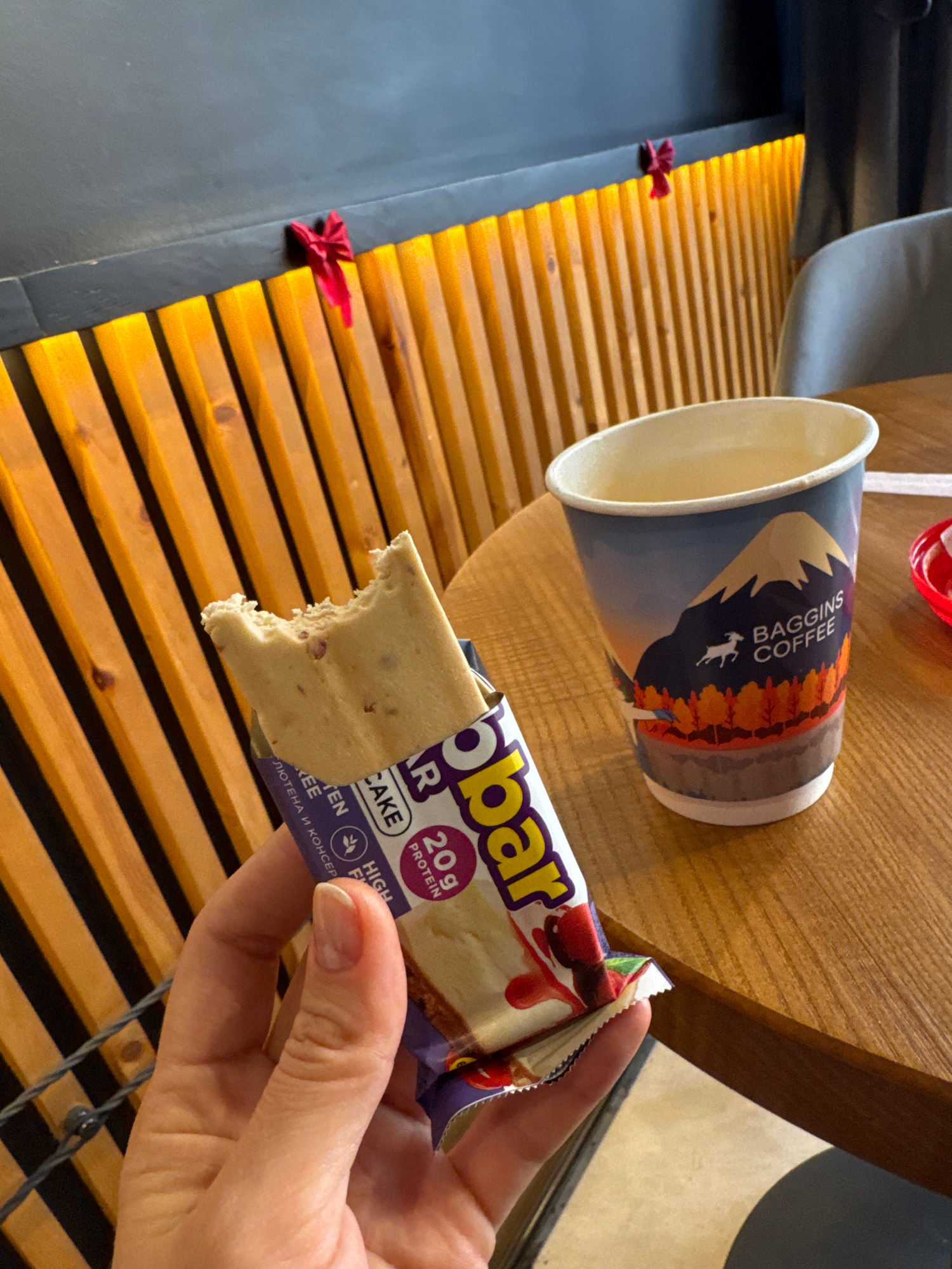 A partially consumed Bob Bar protein bar, specifically cherry cheesecake flavor, is held by a hand. Next to it is a paper coffee cup labeled "Baggins Coffee." The objects are situated on a wooden surf…read more