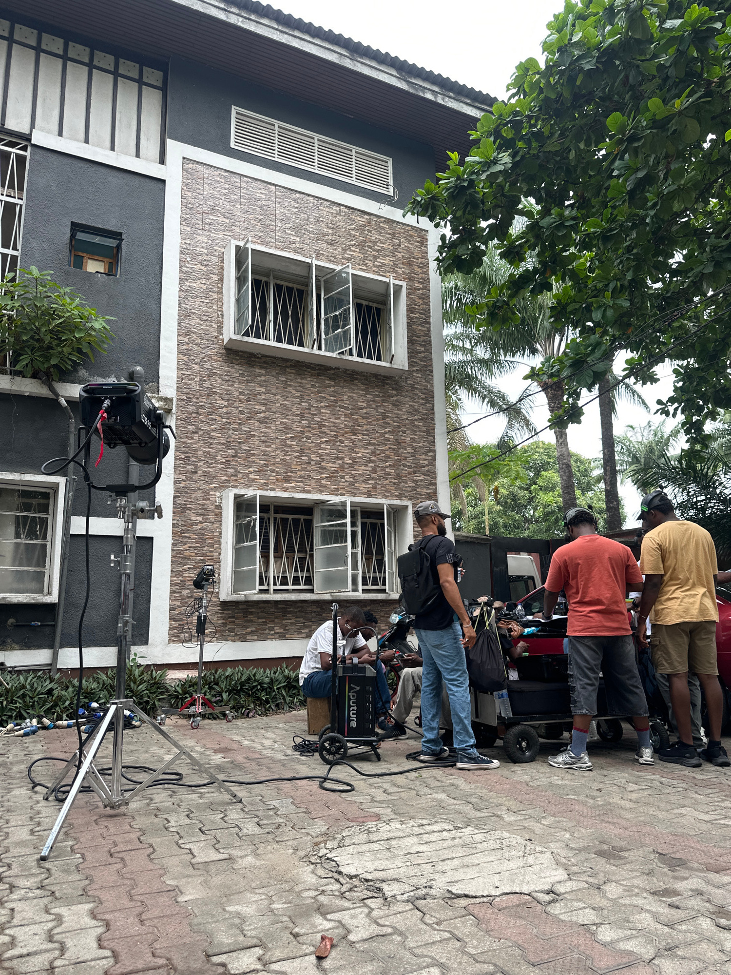 The image shows an outdoor scene in Lagos, Nigeria, featuring a two-story building with a gray and brown tiled exterior. Three windows with white frames are visible on the upper floor, and a smaller w…read more