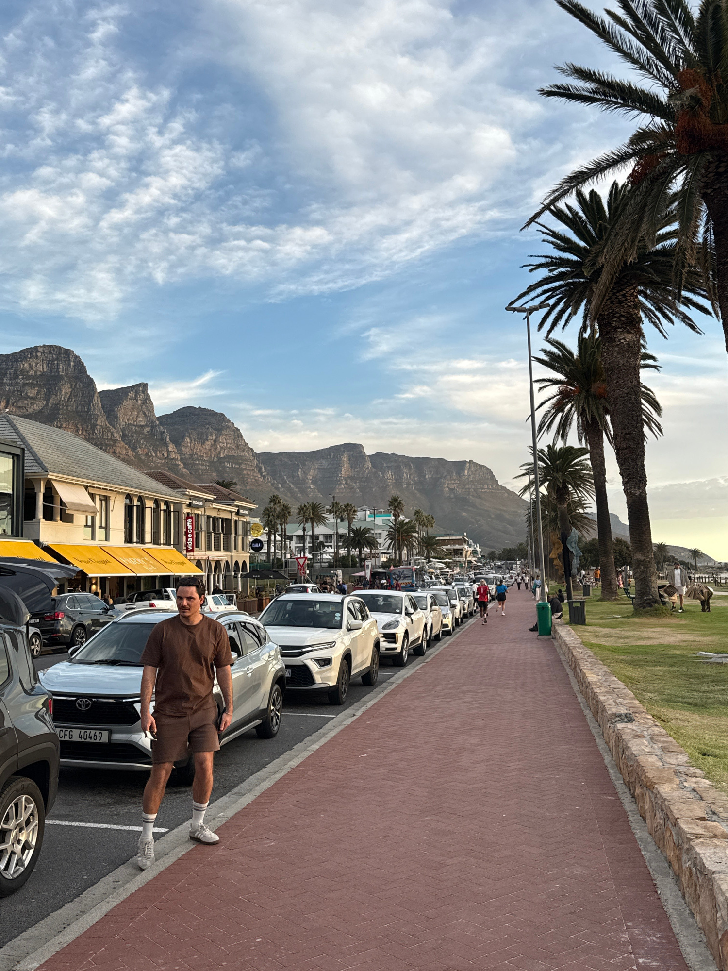 A man in a brown t-shirt and shorts stands on a red-brick sidewalk next to parked cars. The man wears white sneakers and socks. Behind the cars are buildings and mountains. Palm trees line the street.…read more