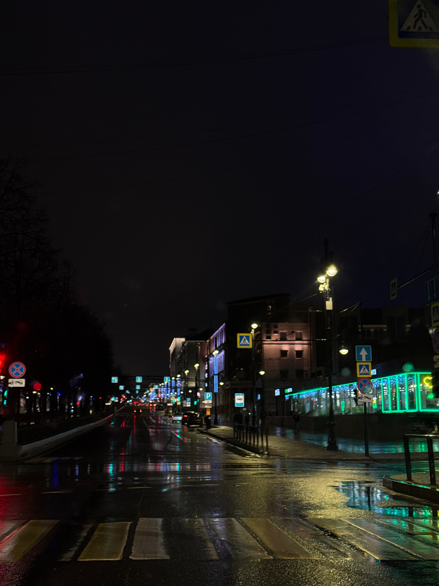 The image shows a night view of a street in Perm, Russia. The street is wet, likely from rain, and reflections of lights are visible on the pavement. There are illuminated buildings and streetlights l…read more