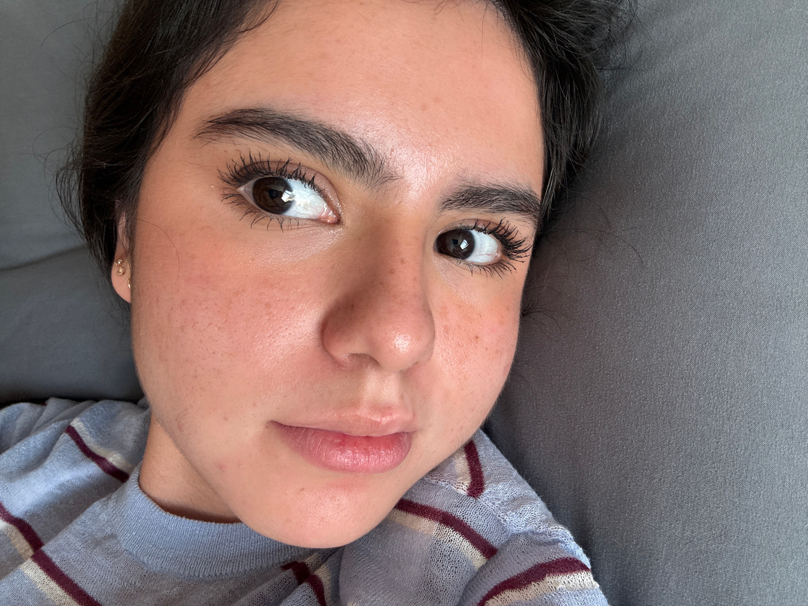 A close-up, eye-level shot of a woman's face, angled upside down. She has dark hair, brown eyes, and fair skin with visible pores and freckles. Her lips are full and slightly parted. She is wearing ma…read more
