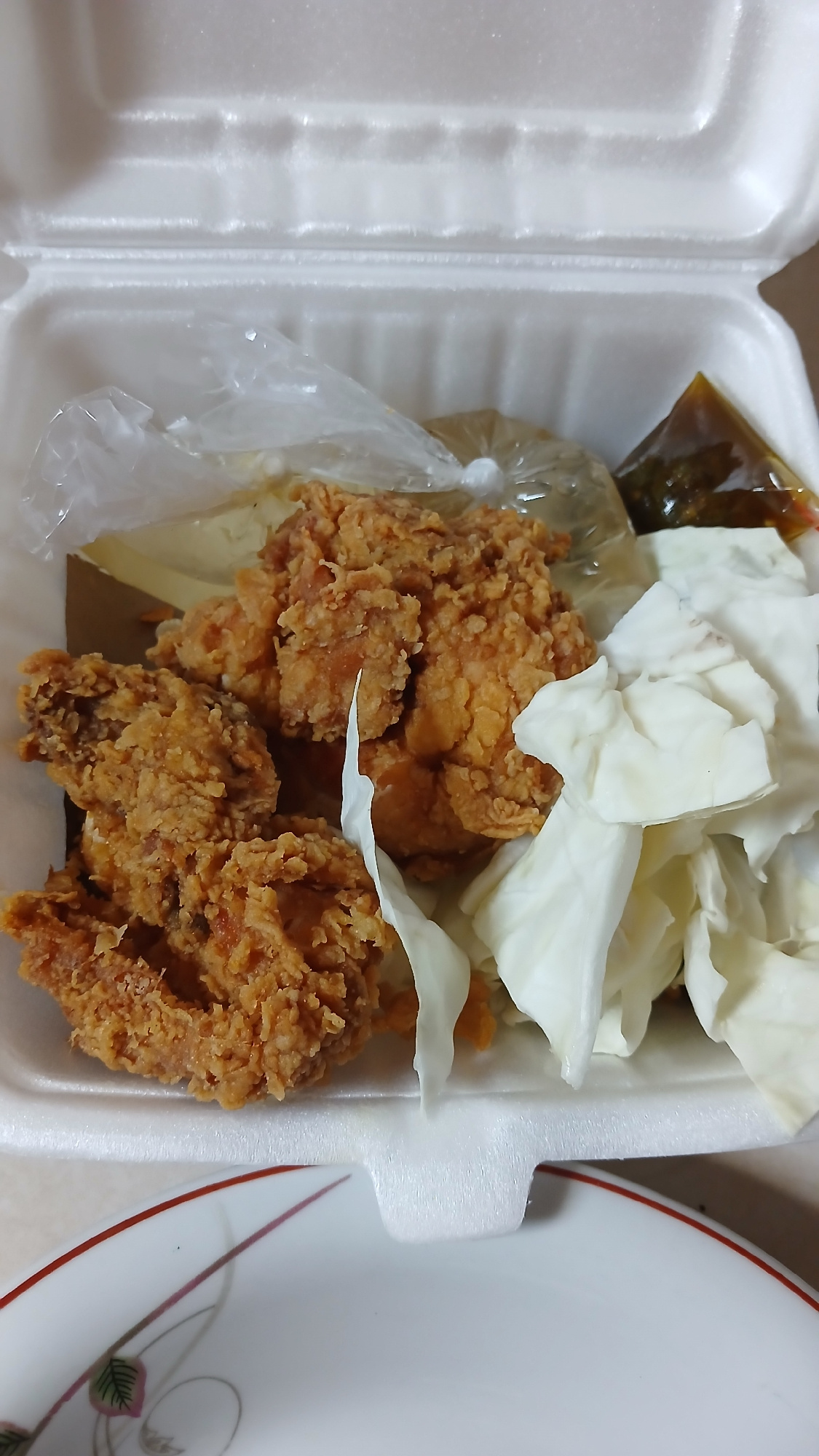A polystyrene food container filled with fried chicken, pieces of white cabbage, and a small plastic bag of dark sauce is shown from an overhead perspective. The container also appears to contain a pa…read more