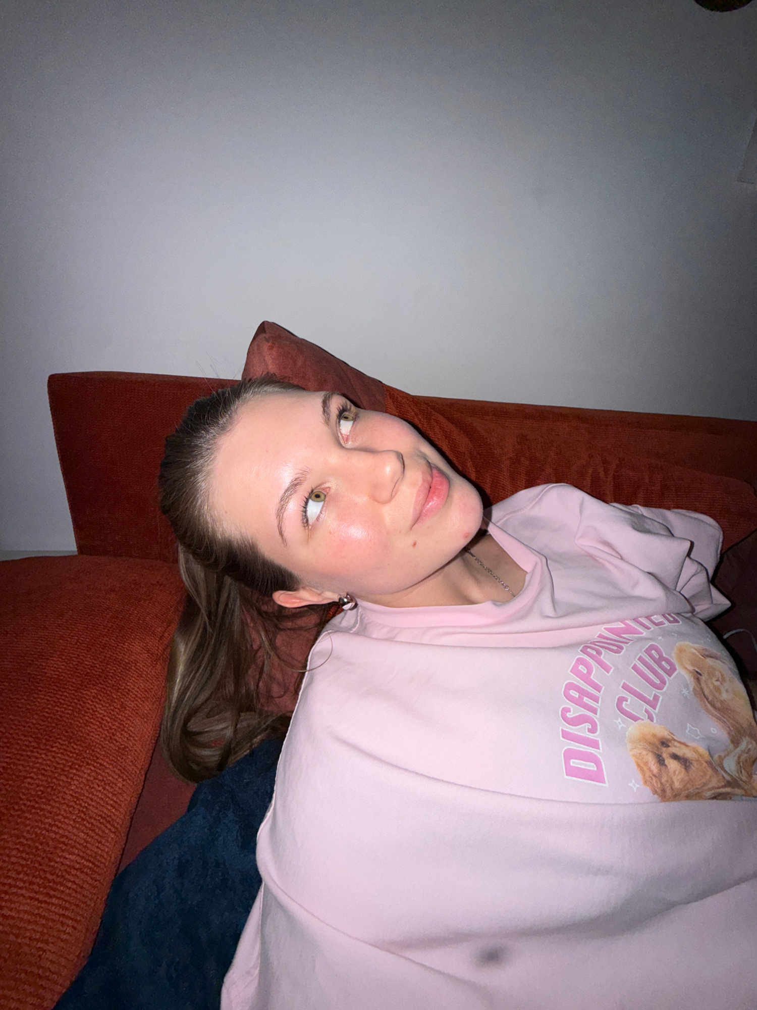 An indoor scene within Vozdovac Urban Municipality, Serbia, depicts a female individual positioned against an orange-red upholstered sofa. Her head is tilted to the left from the viewer's perspective,…read more