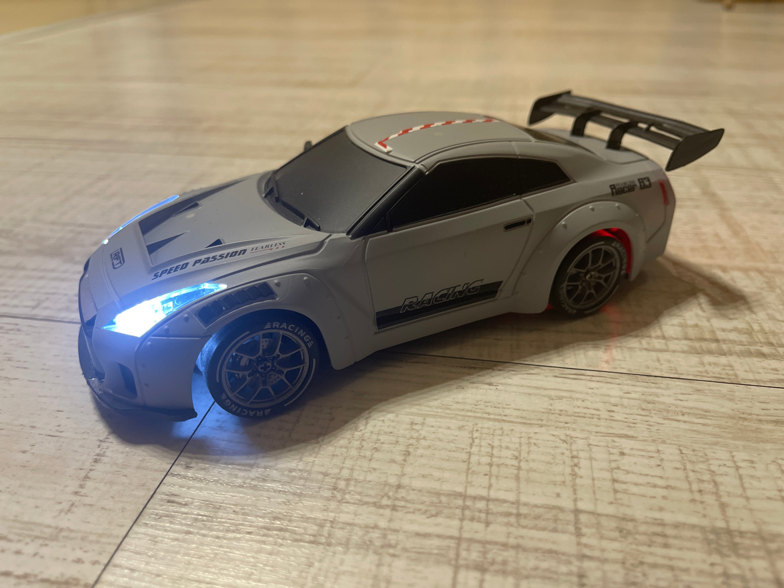 A close-up shot of a toy car on a wooden surface. The car is light gray with black accents, including a large rear spoiler. The car's headlights are illuminated, and there is a racing-themed design on…read more