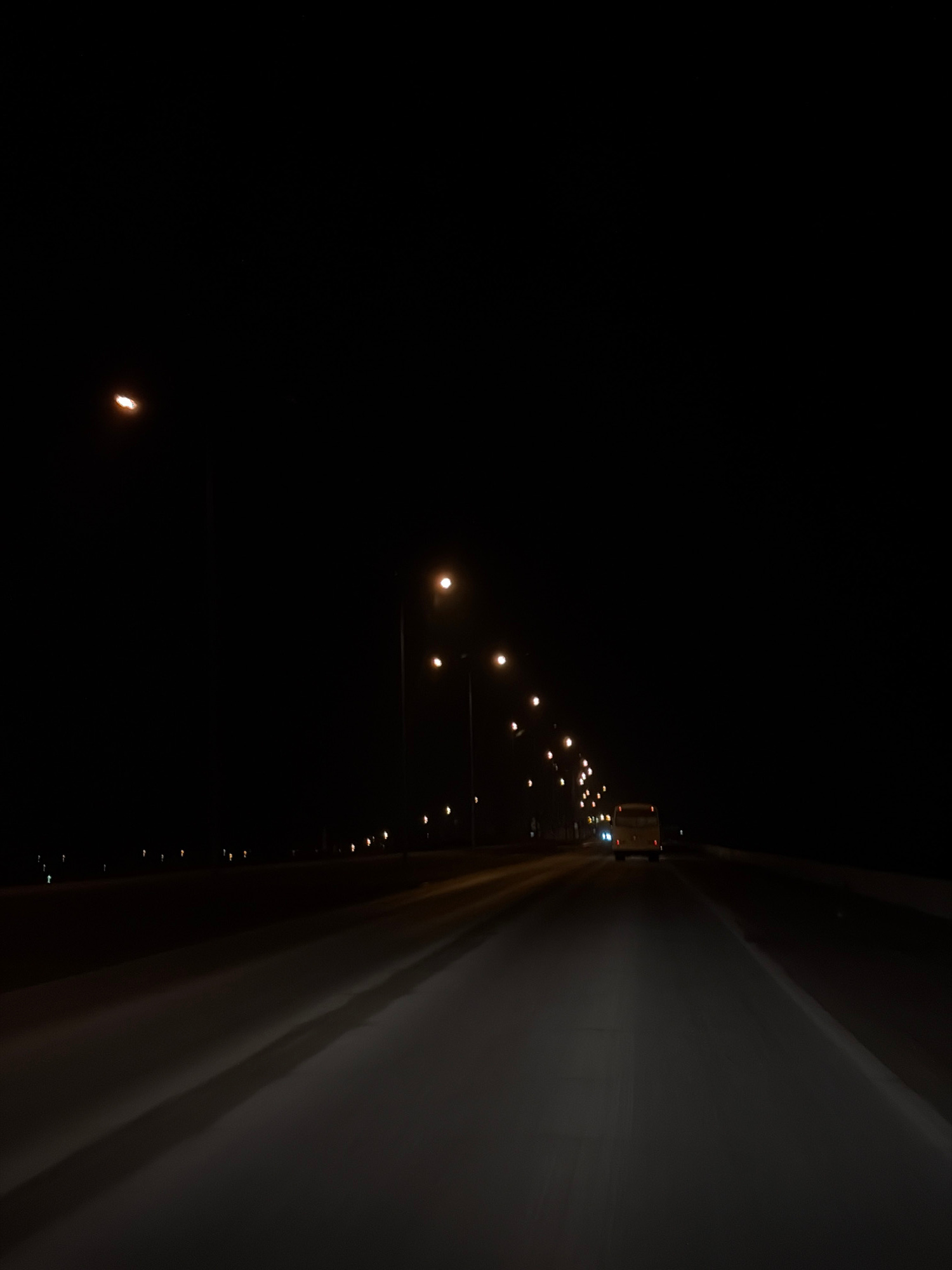 At night in what appears to be Chaikovsky, Russia, a highway is illuminated by evenly spaced streetlights. A large, neutral-toned structure stands to the right. A vehicle with illuminated lights is sl…read more