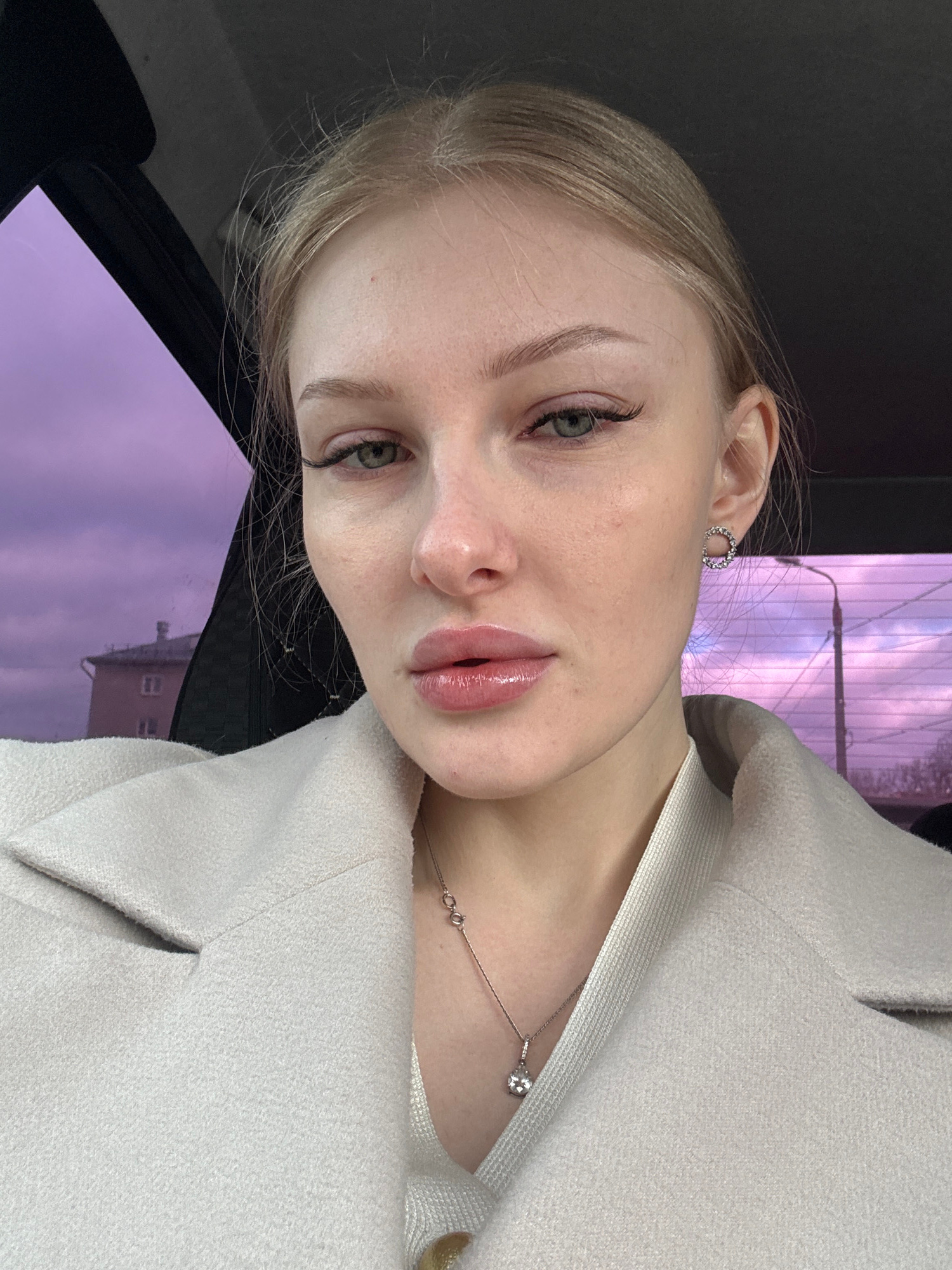 A young woman with fair skin and blonde hair poses for a selfie, wearing a light-colored jacket and a silver necklace. She has light green eyes and is wearing subtle makeup. Her earring is a small, ci…read more