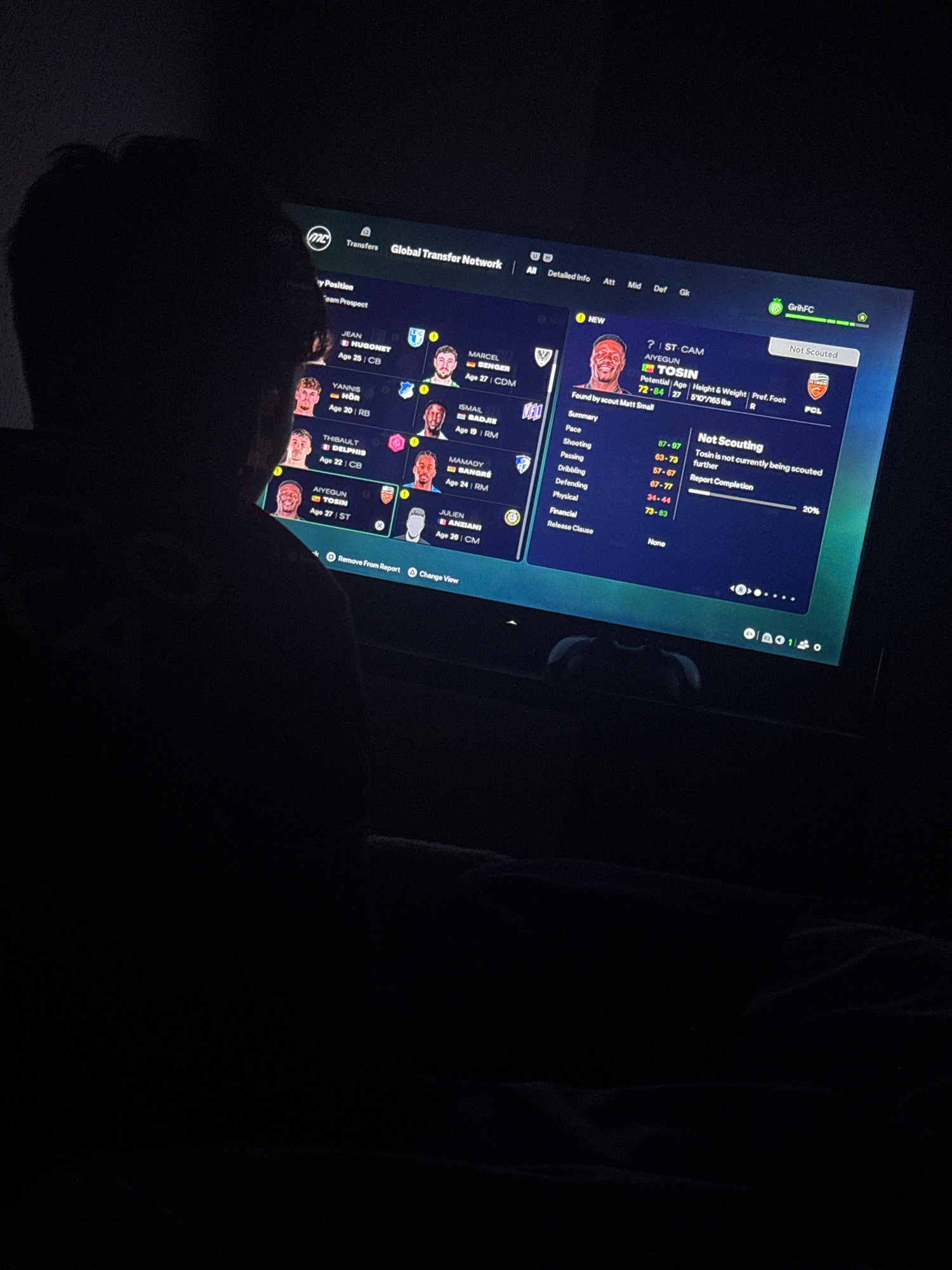 The image shows a person looking at a screen displaying the "Global Transfer Network" interface of a football management simulation video game, possibly FIFA or Football Manager. The player is likely…read more