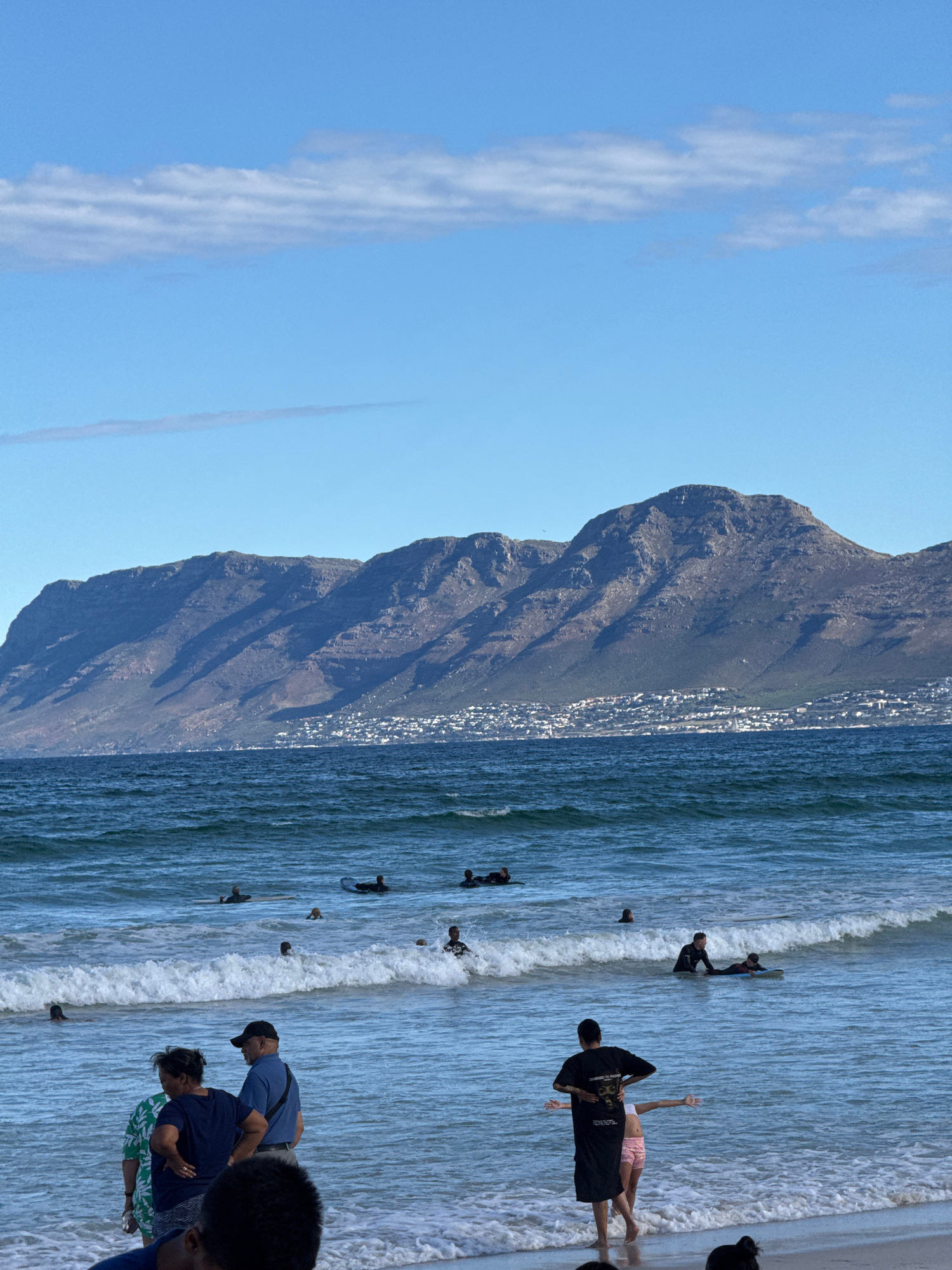 The image presents a view of Muizenberg Beach in South Africa. The scene comprises a wide sandy beach merging into the Atlantic ocean. A rugged mountain range flanks the shoreline. A line of buildings…read more