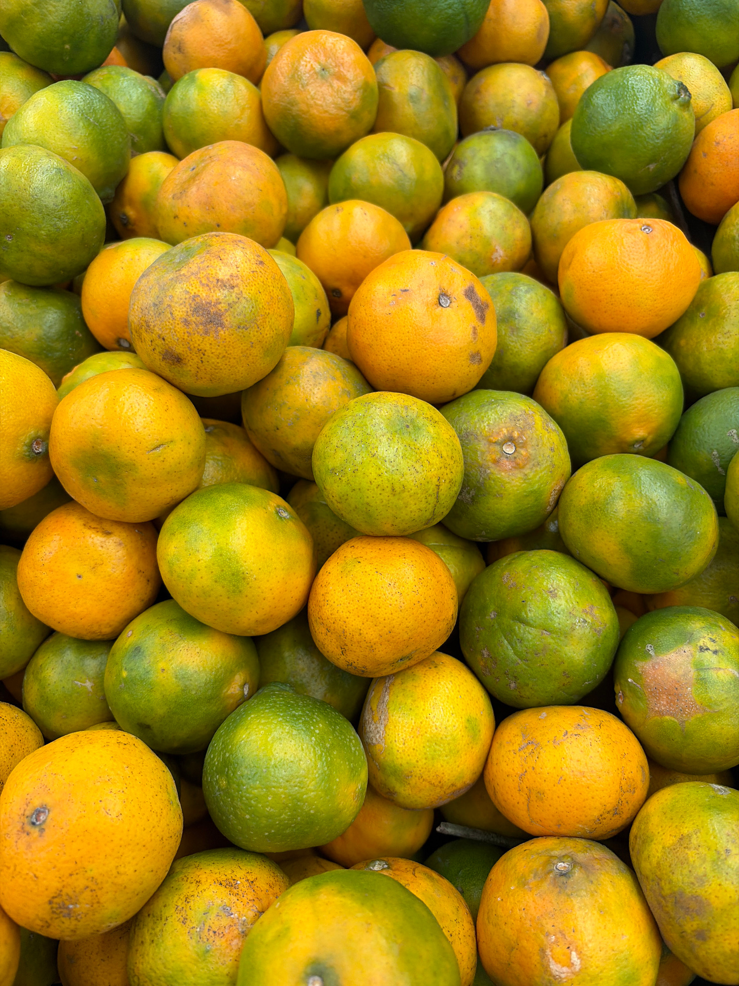 A high-angle, close-up shot shows a dense pile of oranges, many with a mix of green and yellow peel, suggesting they are not fully ripe. The color variation ranges from bright orange to deep green, wi…read more