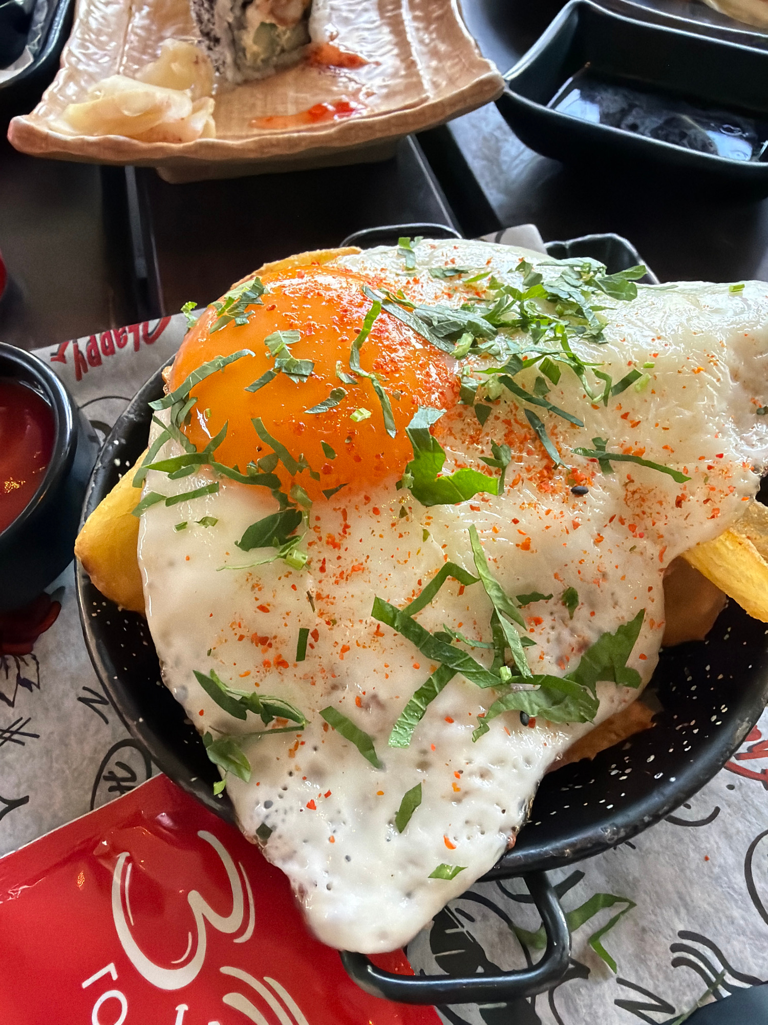 The image shows a close-up of a black metal basket containing fries topped with a fried egg, sprinkled with chopped green herbs and reddish-orange powder. The egg has a bright orange yolk. Next to the…read more
