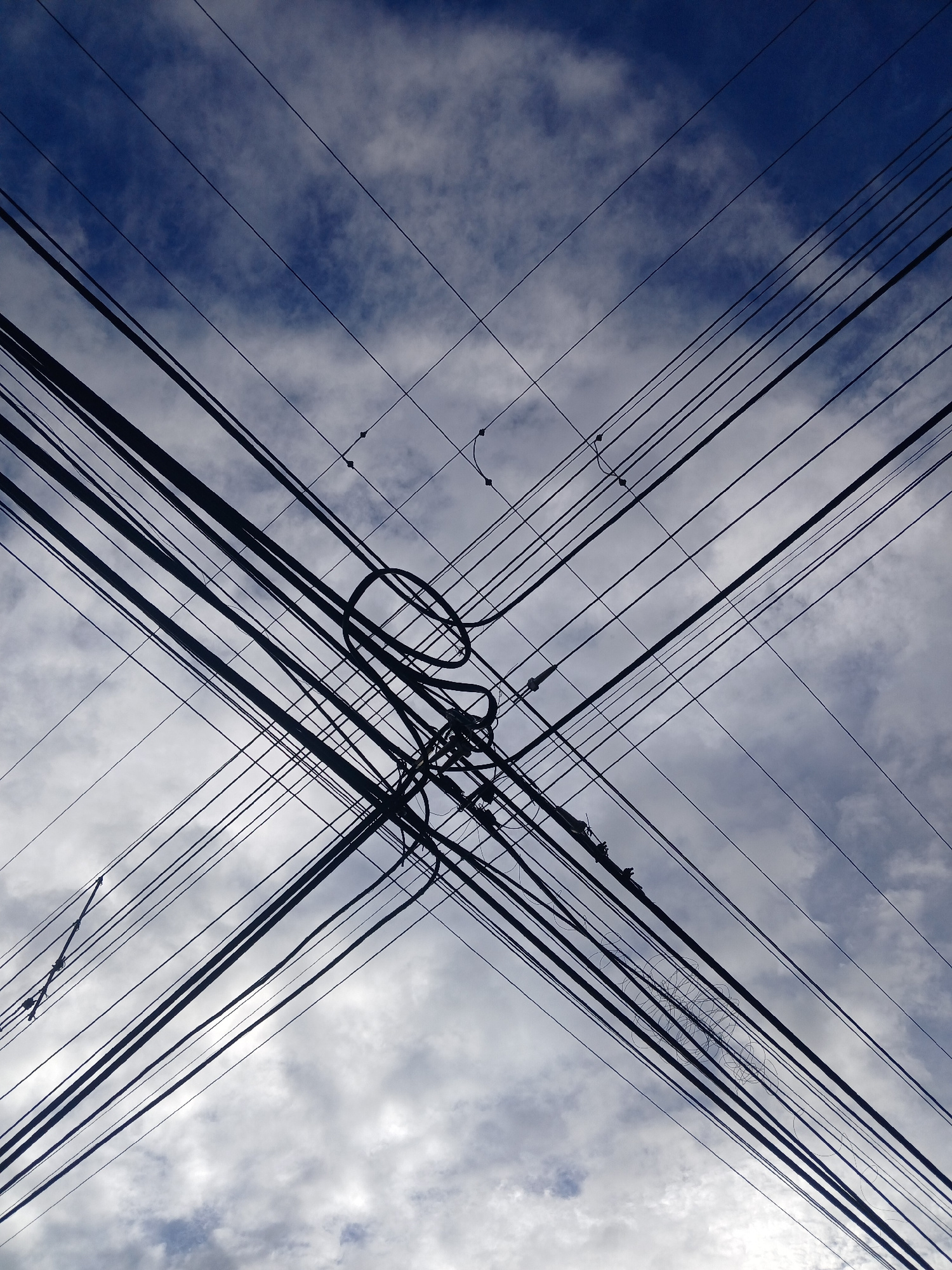 The image depicts a complex network of overhead utility wires, likely electrical and telecommunications lines, viewed from below against a partly cloudy sky in Guayana City, Venezuela. Numerous dark c…read more